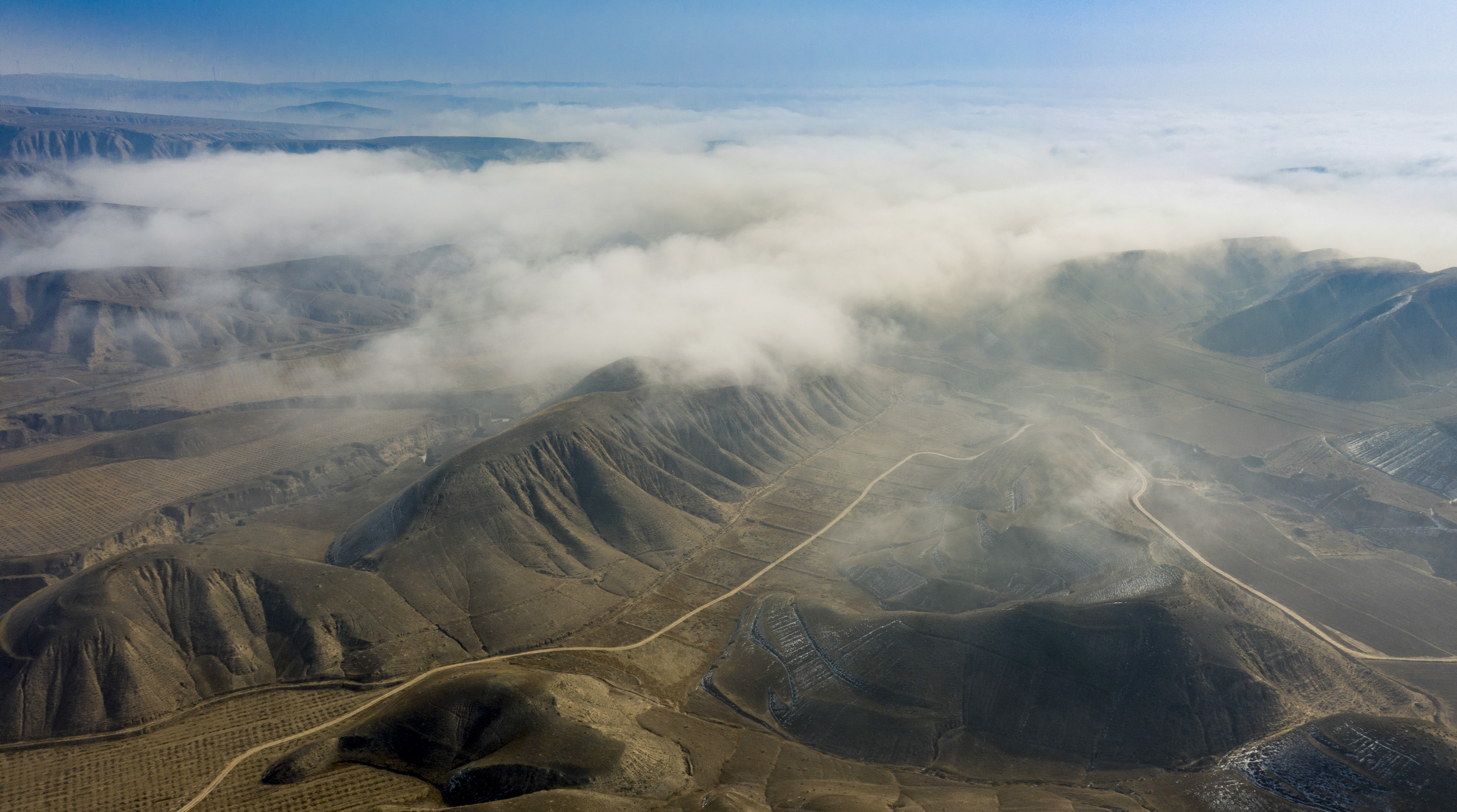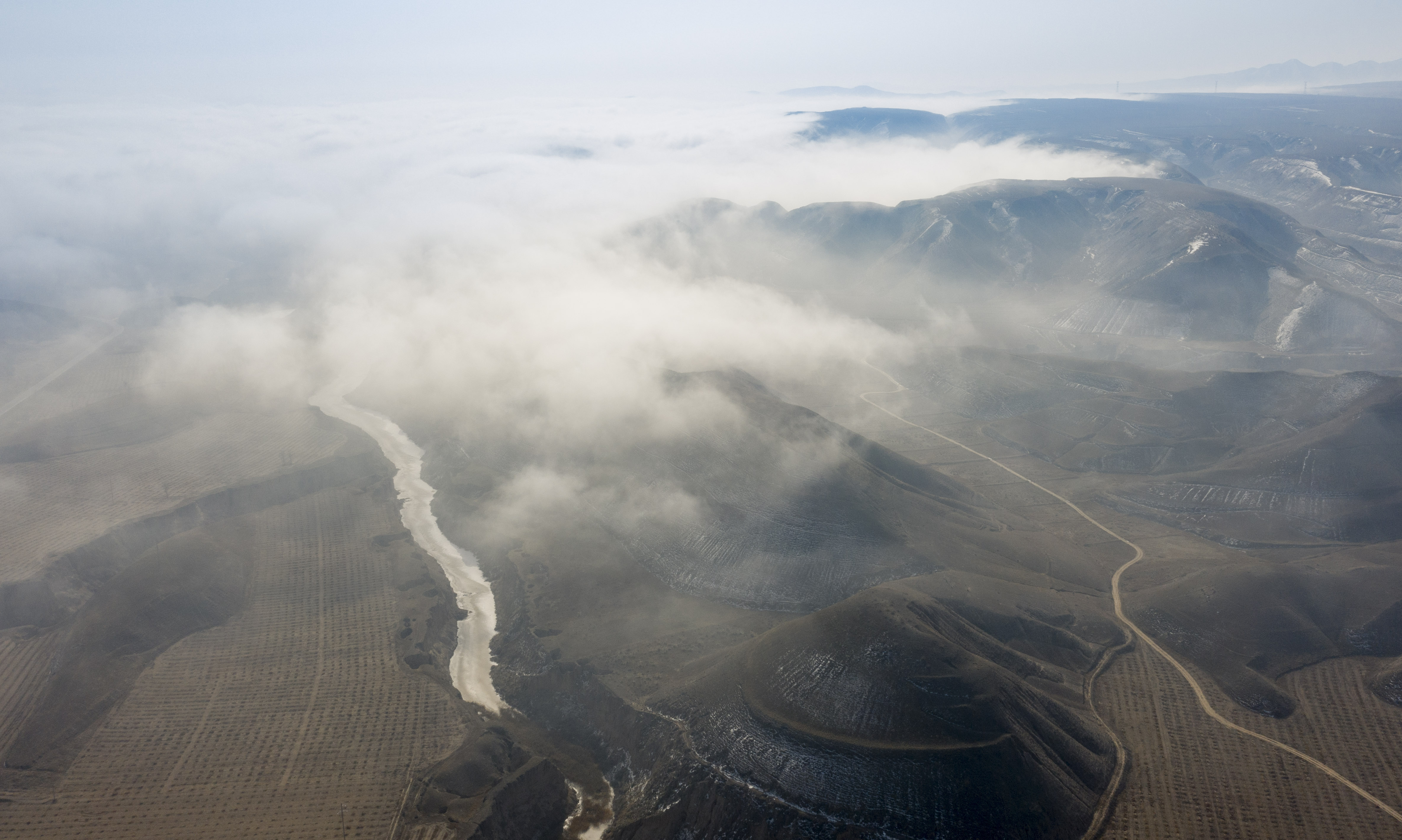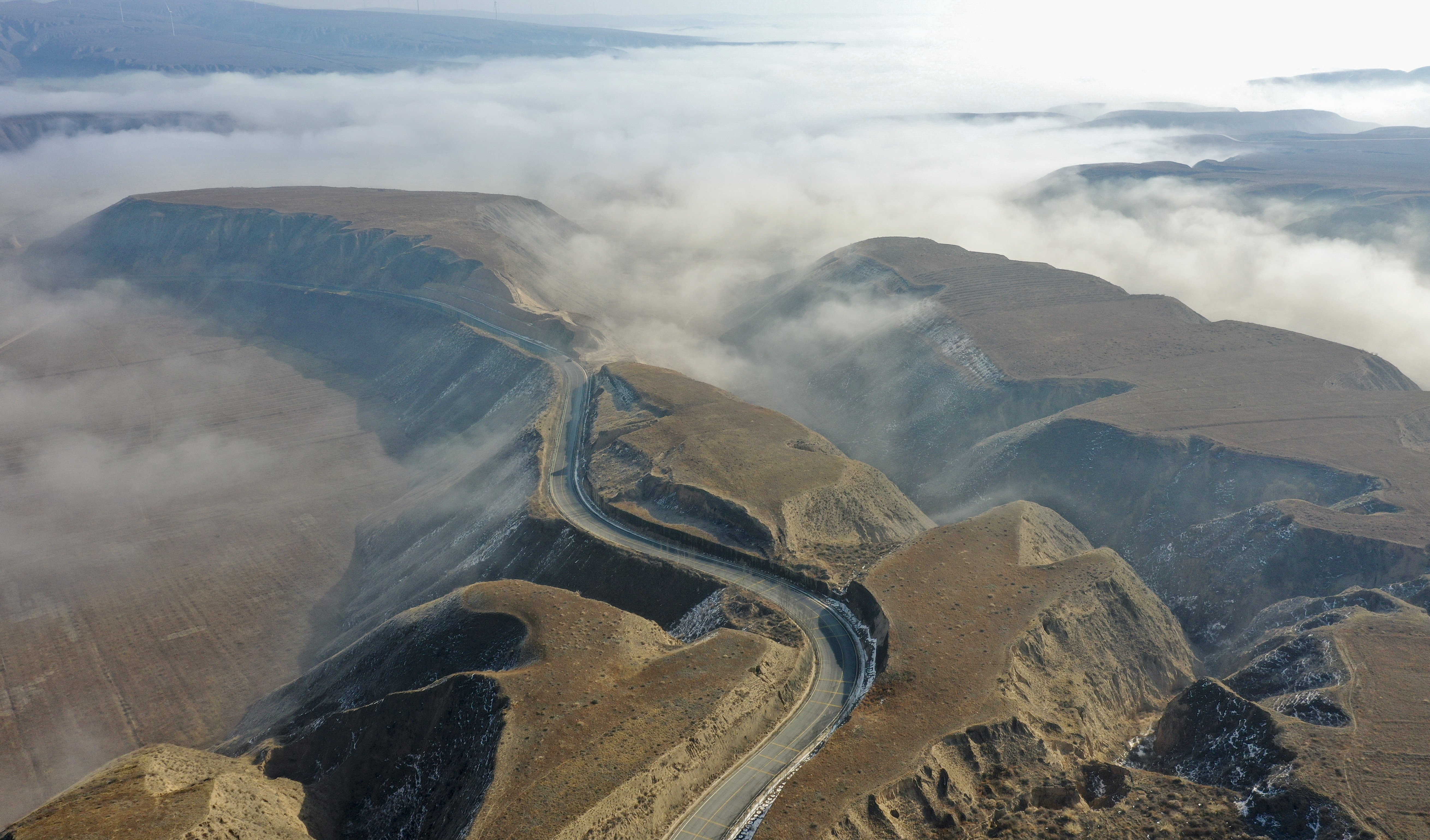 2月22日宁夏吴忠市同心县的山谷间出现云海景观,农田、旱塬、公路在雾中若隐若现,景色壮美。
