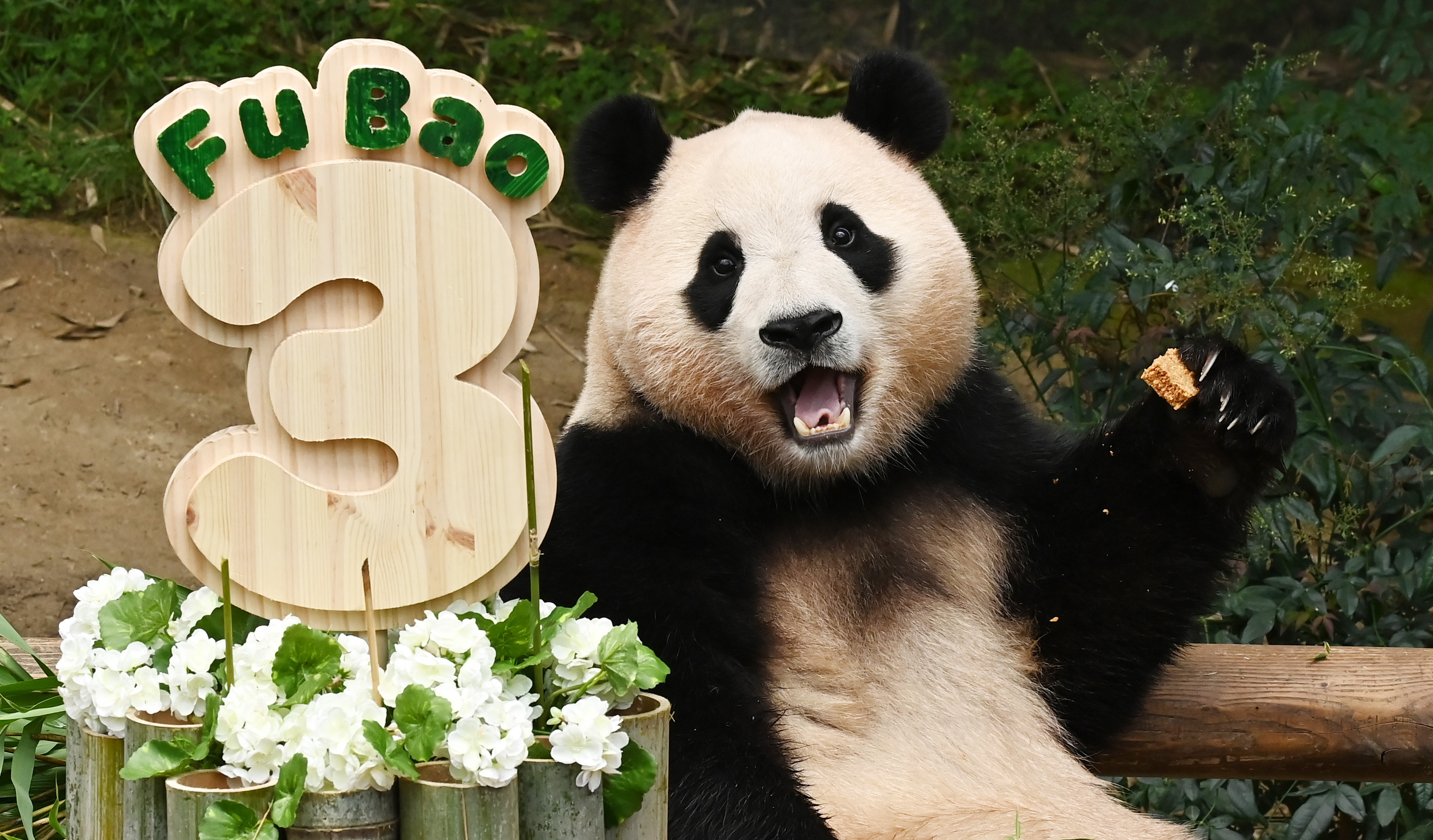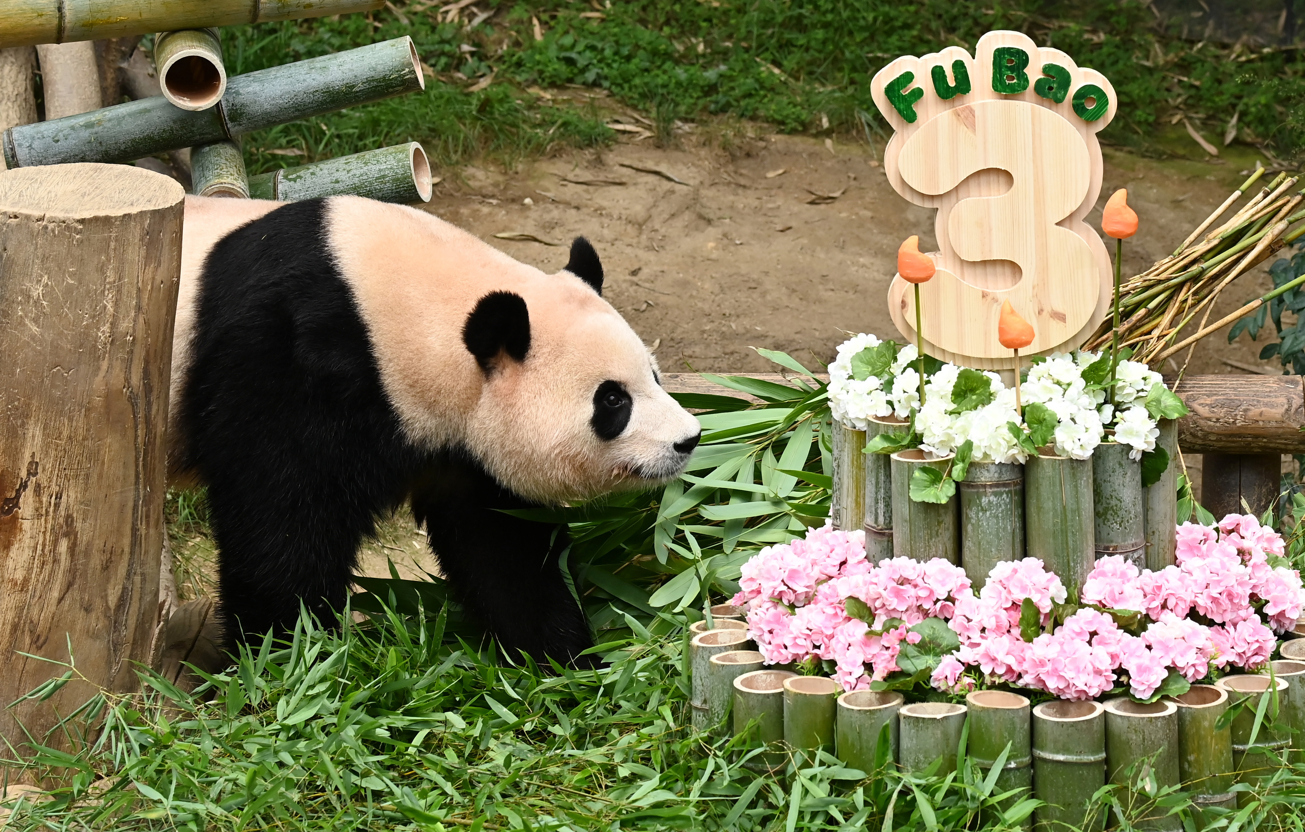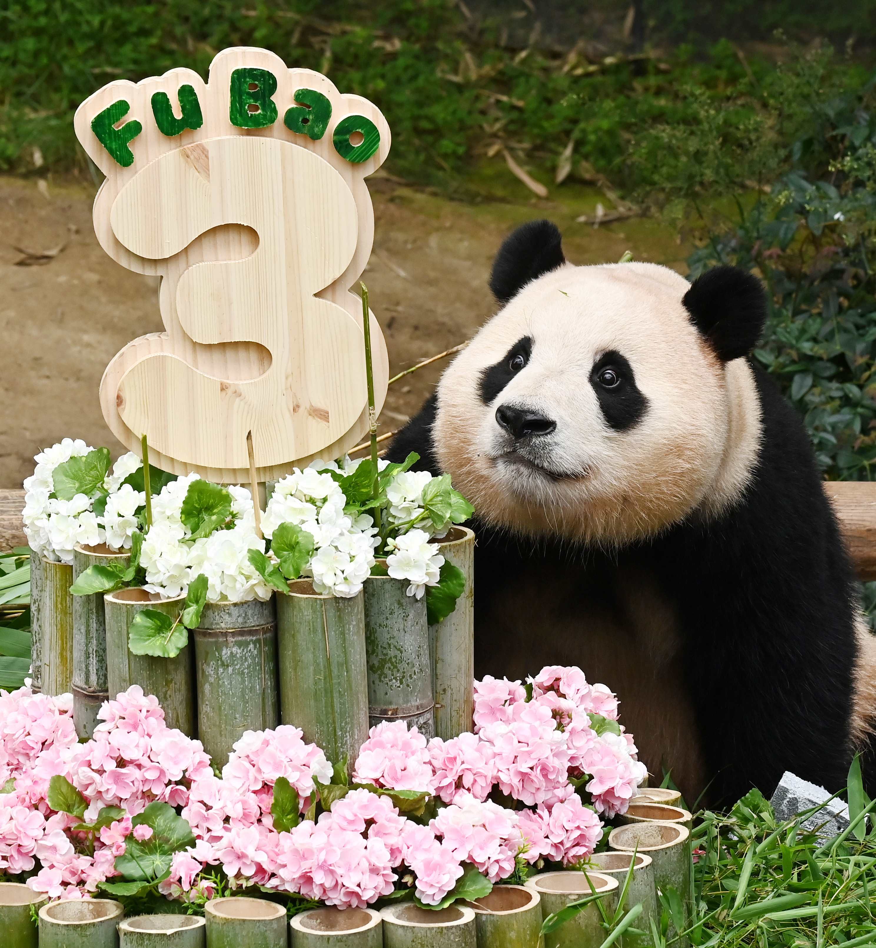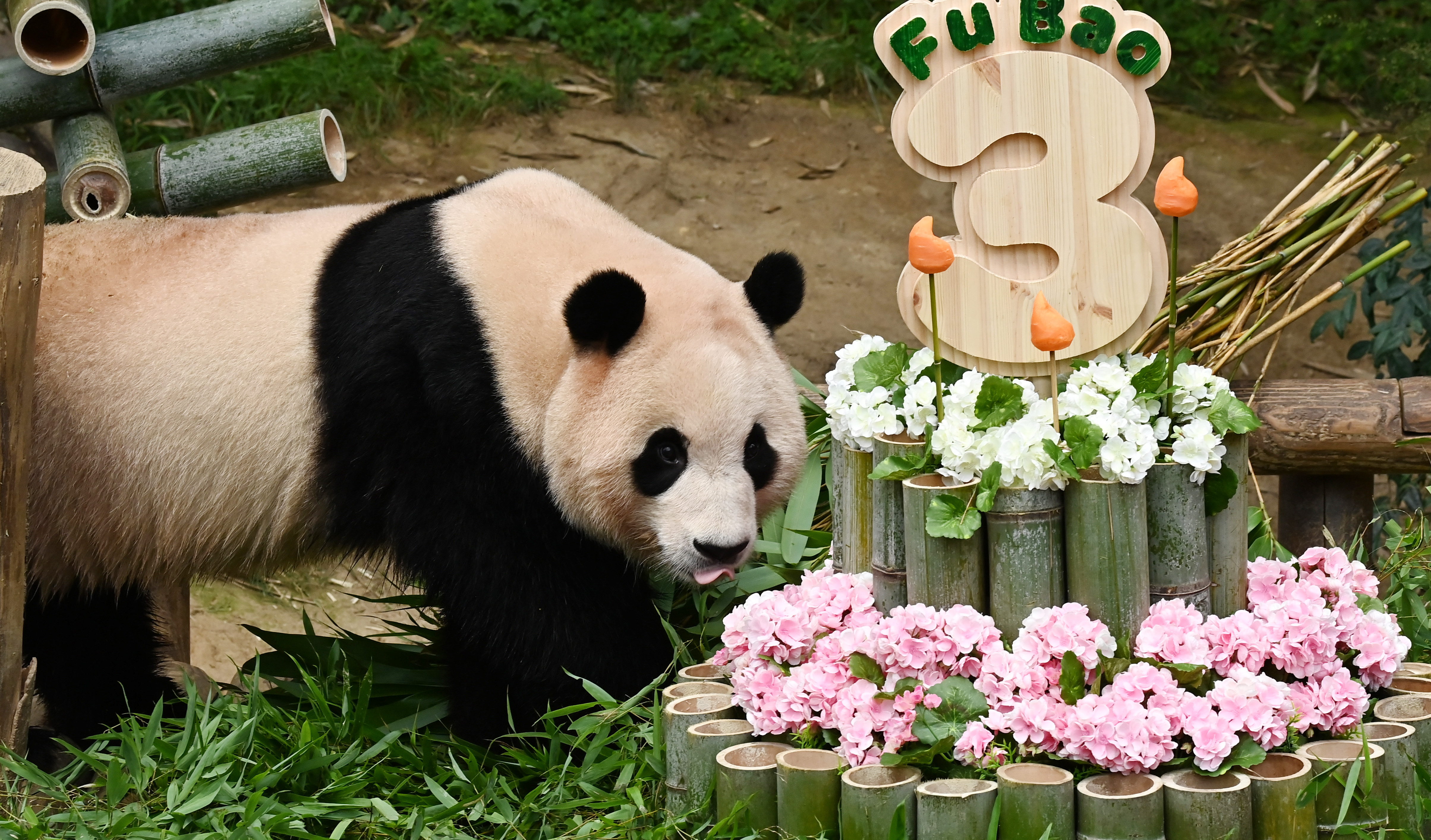 7月20日,在韩国出生的大熊猫“福宝”迎来3岁生日,园区制作了由竹子和胡萝卜组成的“蛋糕”为其庆生。