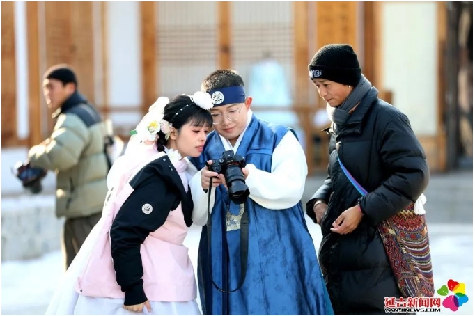 来自云南的杨女士选择了一身传统的白色服装,灰色、粉色的暗纹装饰在裙摆上,增添了几分典雅。她的头发梳成发髻,插上金钗,略上淡妆,清新气息扑面而来。杨女士说:“我们到延吉那天,正好赶上下雪,觉得冬季的延吉更是独具魅力。朝鲜族传统服饰跟我们汉族服饰非常不同,也想来体验一下。我在小红书和抖音上刷到了朝鲜族民俗园的拍照项目,都很漂亮,很有民族特色,下次有机会还会来的。”