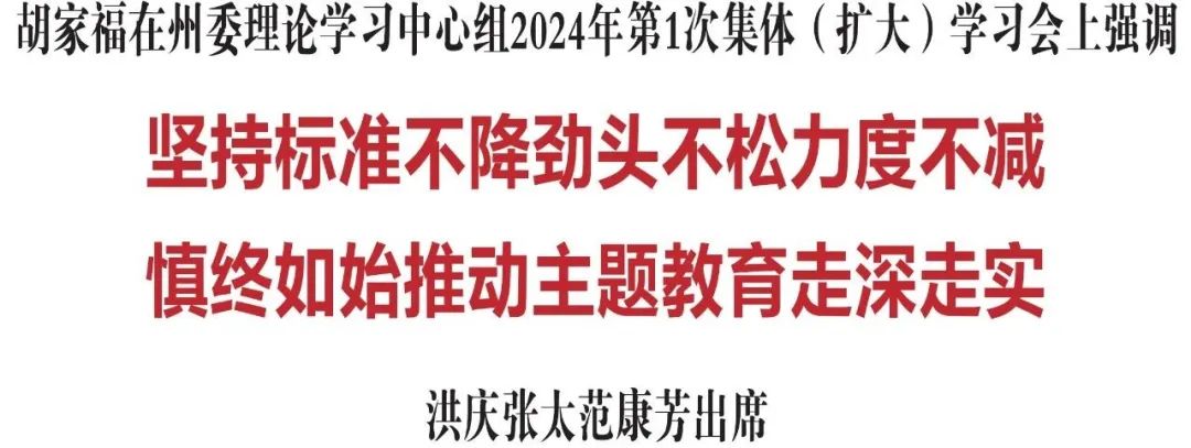 1月14日,省委常委、州委书记胡家福主持召开州委理论学习中心组2024年第1次集体(扩大)学习会,专题学习习近平总书记重要讲话重要指示批示精神、学习党章和有关党内法规。他强调,要深入学习贯彻习近平总书记关于主题教育的重要讲话和重要指示批示精神,坚持标准不降、劲头不松、力度不减,慎终如始推动主题教育走深走实,持续在以学铸魂、以学增智、以学正风、以学促干上下真功见实效。州委副书记、州长洪庆,州人大常委会主任张太范,州政协主席康芳出席会议。