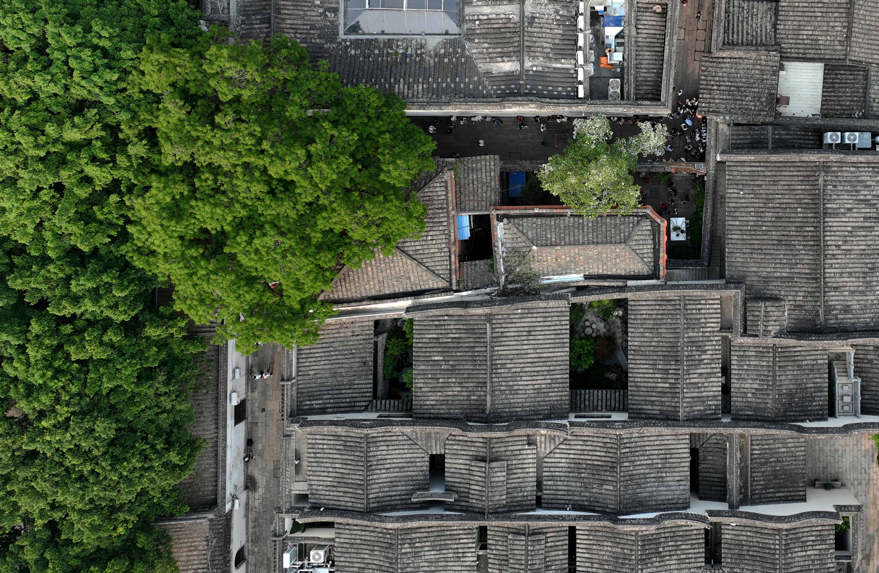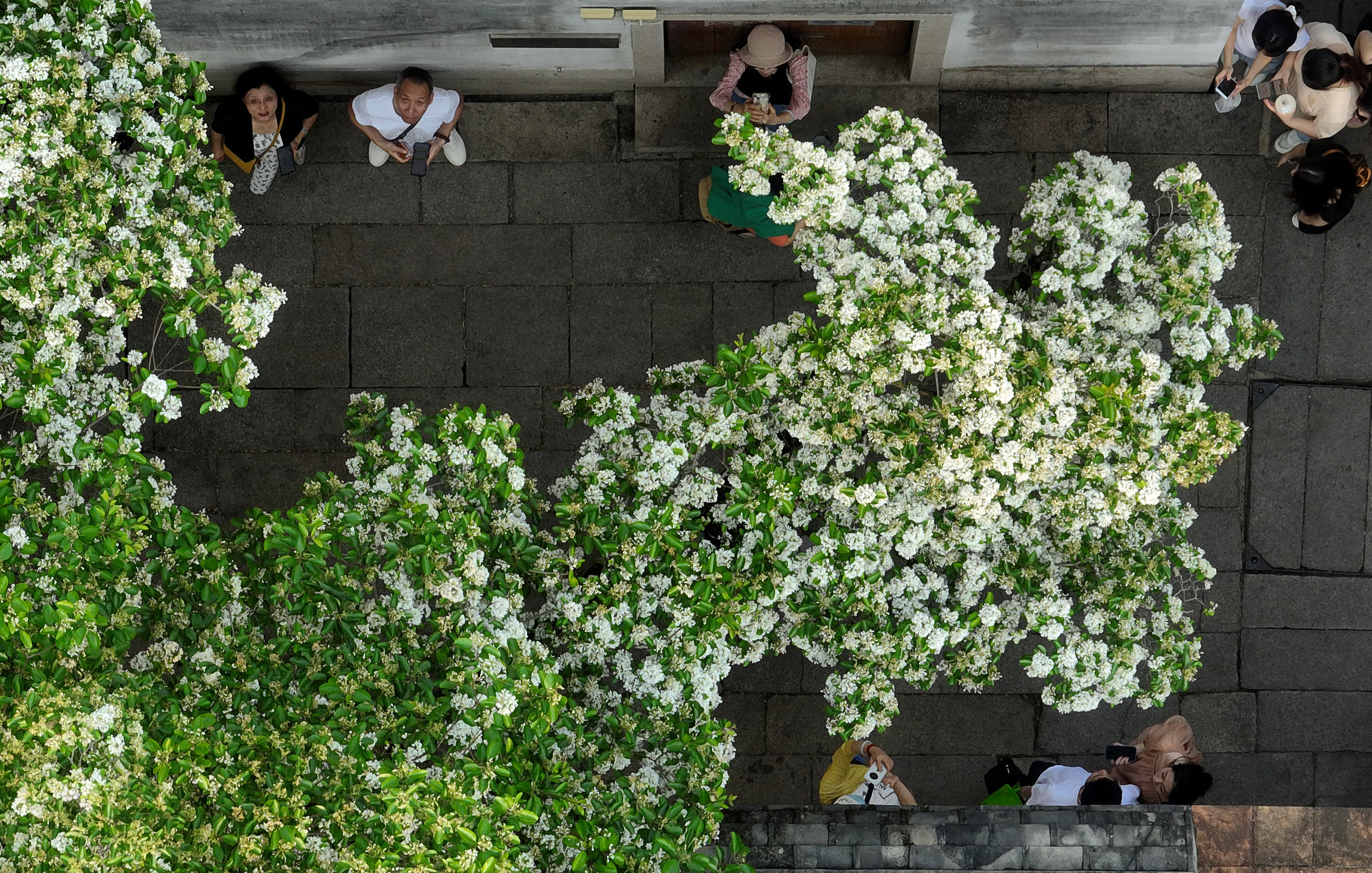 近日,福州千年古街三坊七巷衣锦坊里的一株百年流苏树繁花盛开,吸引市民和游客驻足观赏、拍照。