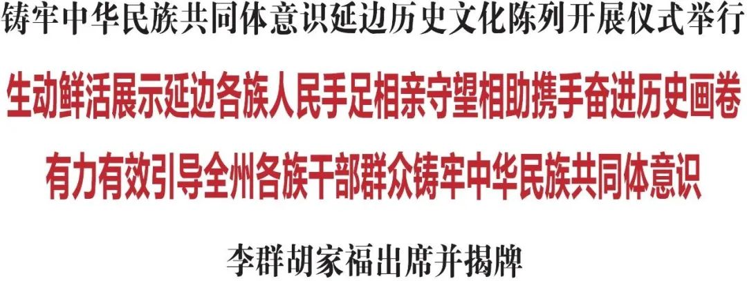9月3日,在欢庆延边朝鲜族自治州成立72周年之际,铸牢中华民族共同体意识延边历史文化陈列开展仪式在延吉举行。文旅部副部长、国家文物局局长李群,省委常委、州委书记胡家福出席仪式,并共同为铸牢中华民族共同体意识延边历史文化陈列揭牌。州人大常委会主任张太范、州政协主席康芳出席仪式。