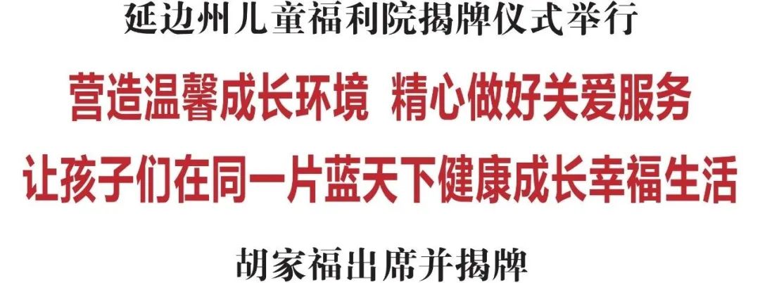 随后,胡家福、杜文革等出席仪式的领导嘉宾走进延边州儿童福利院,实地参观儿童生活区、学习区、康复区等功能区,详细了解儿童日常管护、康复训练等情况。胡家福动情地说,儿童是祖国的花朵,福利院的儿童是最柔弱的花朵,更需要党委政府和全社会的关心关爱。民政部门和福利院要深入贯彻习近平总书记关于少年儿童工作的重要论述,认真落实各项保障政策,营造温馨有爱的成长环境,提供精准专业的关爱服务,带着感情、带着责任做好生活照料、教育培养等工作,让他们和其他少年儿童一样,在同一片蓝天下健康成长、幸福生活。广大教职员工要以强烈的事业心和责任感投入到工作中,像爱护自己的子女一样精心抚育、悉心栽培、耐心教养,细心细致照顾好、教育好每一个孩子,当好他们成长道路上的引路人、守护者。希望社会各界秉持仁爱之心、关爱之情,积极组织开展结对帮扶、走访慰问、爱心捐助等公益活动,让孩子们充分感受到社会主义大家庭的关怀和温暖。