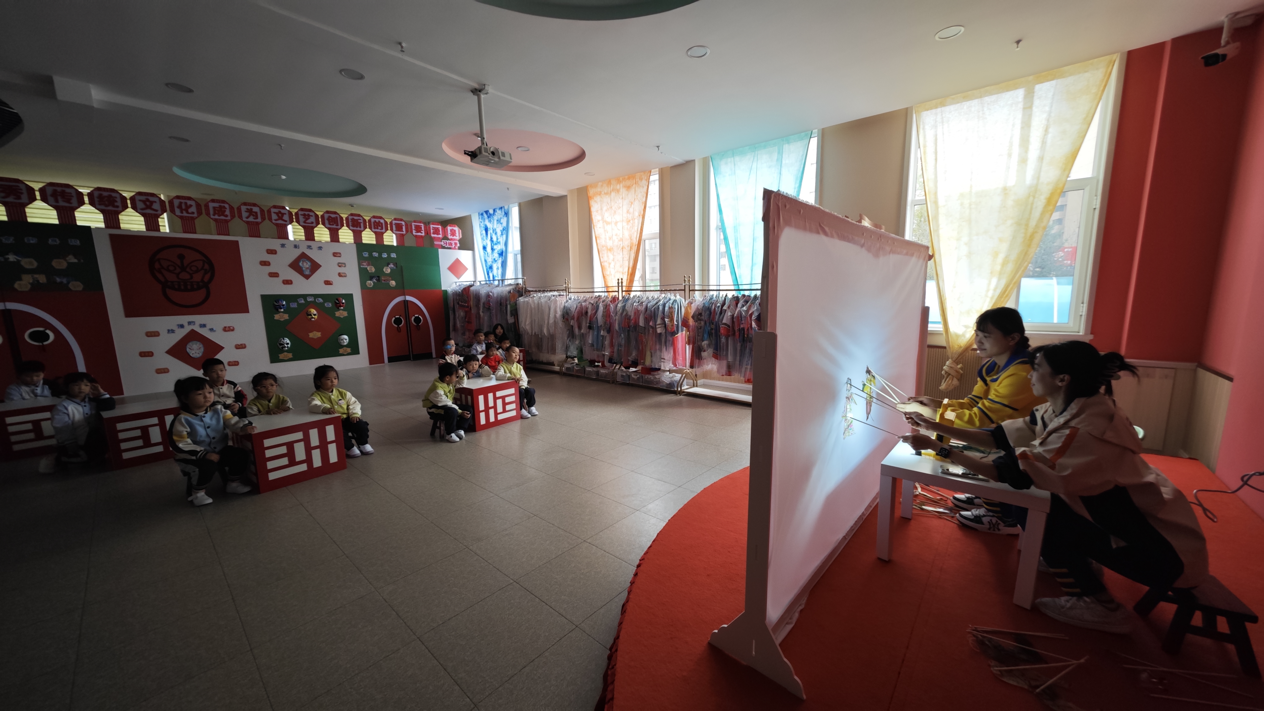 在幼儿园一楼“国粹苑”里,灯光昏暗,小朋友们个个端坐,不错眼珠地看向前方,眼神里闪着好奇、惊喜的光。原来,他们正在看一场讲述花木兰替父从军故事的皮影戏。