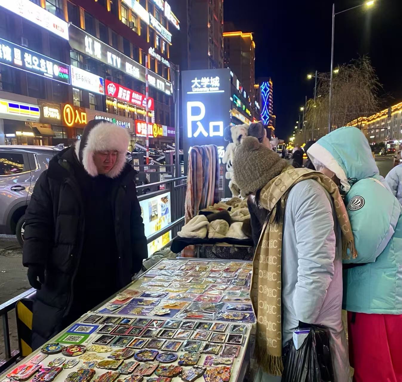 随着新雪季的到来,延边冬季旅游热度不断攀升,吸引了大量游客。图为外地游客在延边大学网红墙附近购买旅游商品。