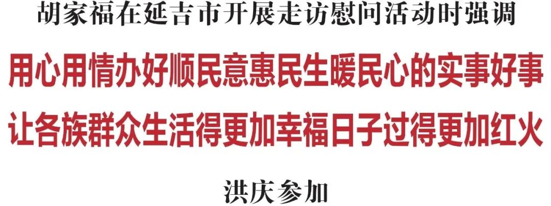 在延边大学,胡家福看望了延边大学副校长、理学院教授王洪福和延边大学附属医院心血管内科主任、教授成宪武,详细询问工作、生活情况,向他们致以新春祝福。胡家福说,推动延边跨越赶超,离不开专家人才的有力支撑。希望王洪福、成宪武两位专家人才更好发挥学术优势和技术专长,在本岗位本领域上精钻细研、攻坚突破,推动更多学术成果在延落地转化,为延边经济社会发展作出更大贡献。全州各级党委、政府要尊重人才、关心人才,做深做实服务保障工作,着力打造“近悦远来”的人才发展环境,让延边因人才更精彩、人才因延边更出彩。