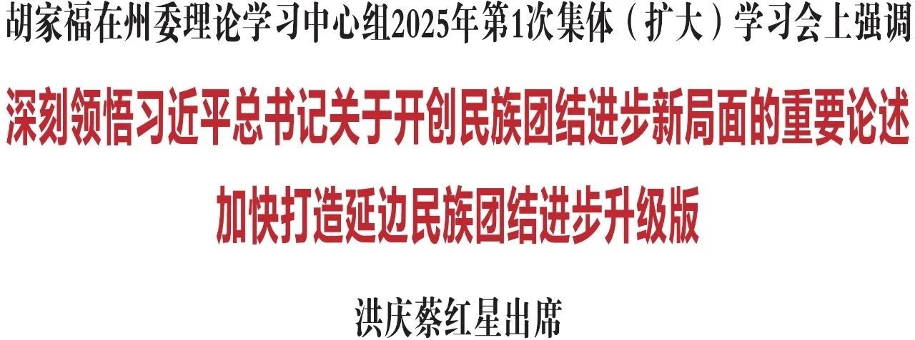 2月11日,省委常委、州委书记胡家福主持召开州委理论学习中心组2025年第1次集体(扩大)学习会。他强调,要认真学习习近平总书记在听取吉林省委省政府工作汇报时的重要讲话精神,深刻领悟习近平总书记关于开创民族团结进步新局面的重要论述,进一步增强铸牢中华民族共同体意识、推进中华民族共同体建设的政治自觉、思想自觉、行动自觉,在有形上更用心、有感上更用情、有效上更用力,加快打造延边民族团结进步升级版。州委副书记、州长洪庆,州人大常委会主任蔡红星出席会议。
