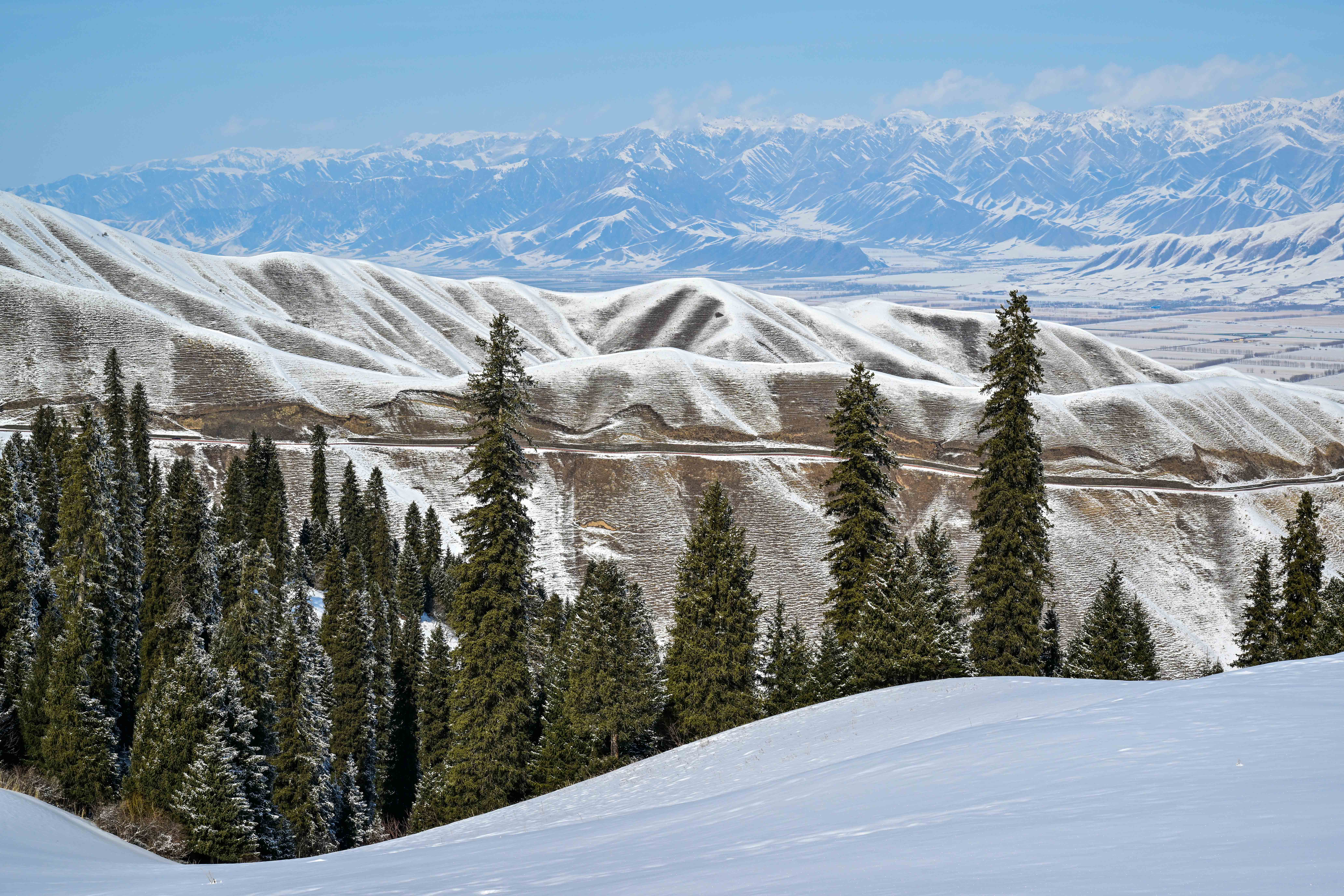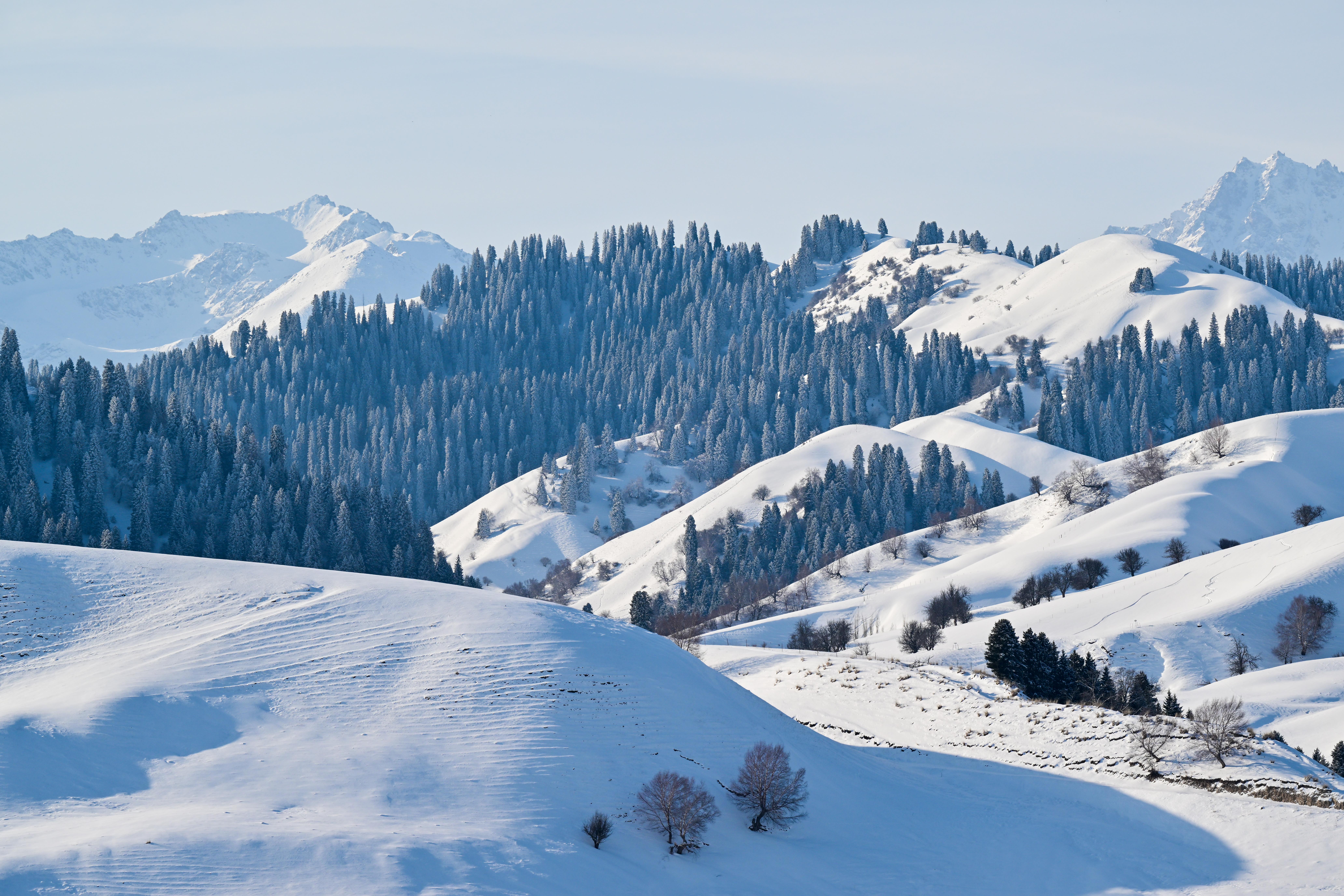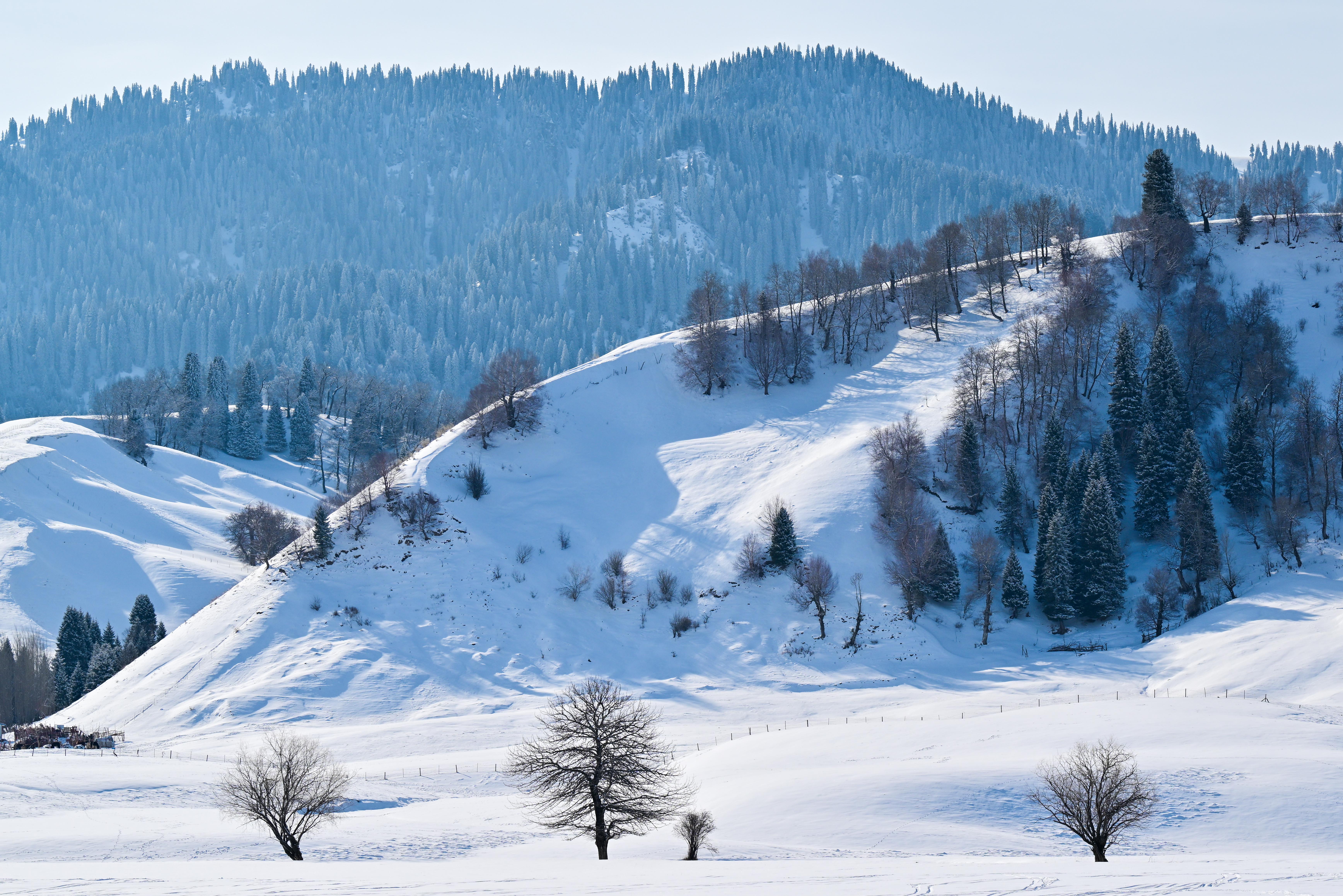 一场降雪过后,位于新疆伊犁哈萨克自治州新源县的新疆那拉提国家旅游度假区一片银装素裹。连绵起伏的草坡被白雪覆盖,巍峨的山峰格外壮观。松林在冰雪中屹立,阳光洒落,美不胜收。