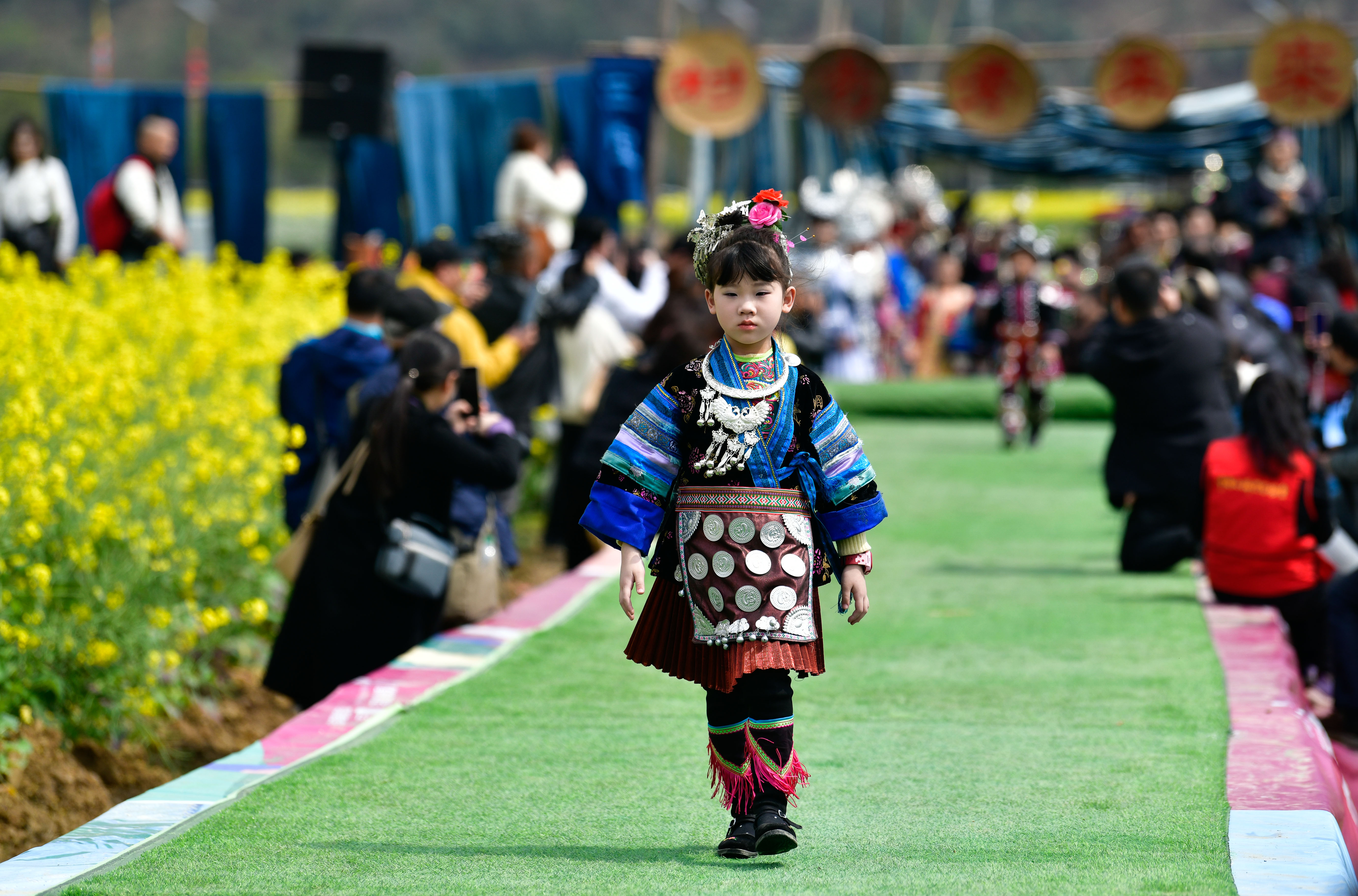 3月16日,在贵州省黔东南苗族侗族自治州榕江县车江大坝,一场以“村秀·秀未来”为主题的民族服装秀在花田间举行。服装秀以村民为主角,以花田为舞台,展示黔东南多姿多彩的民族文化。