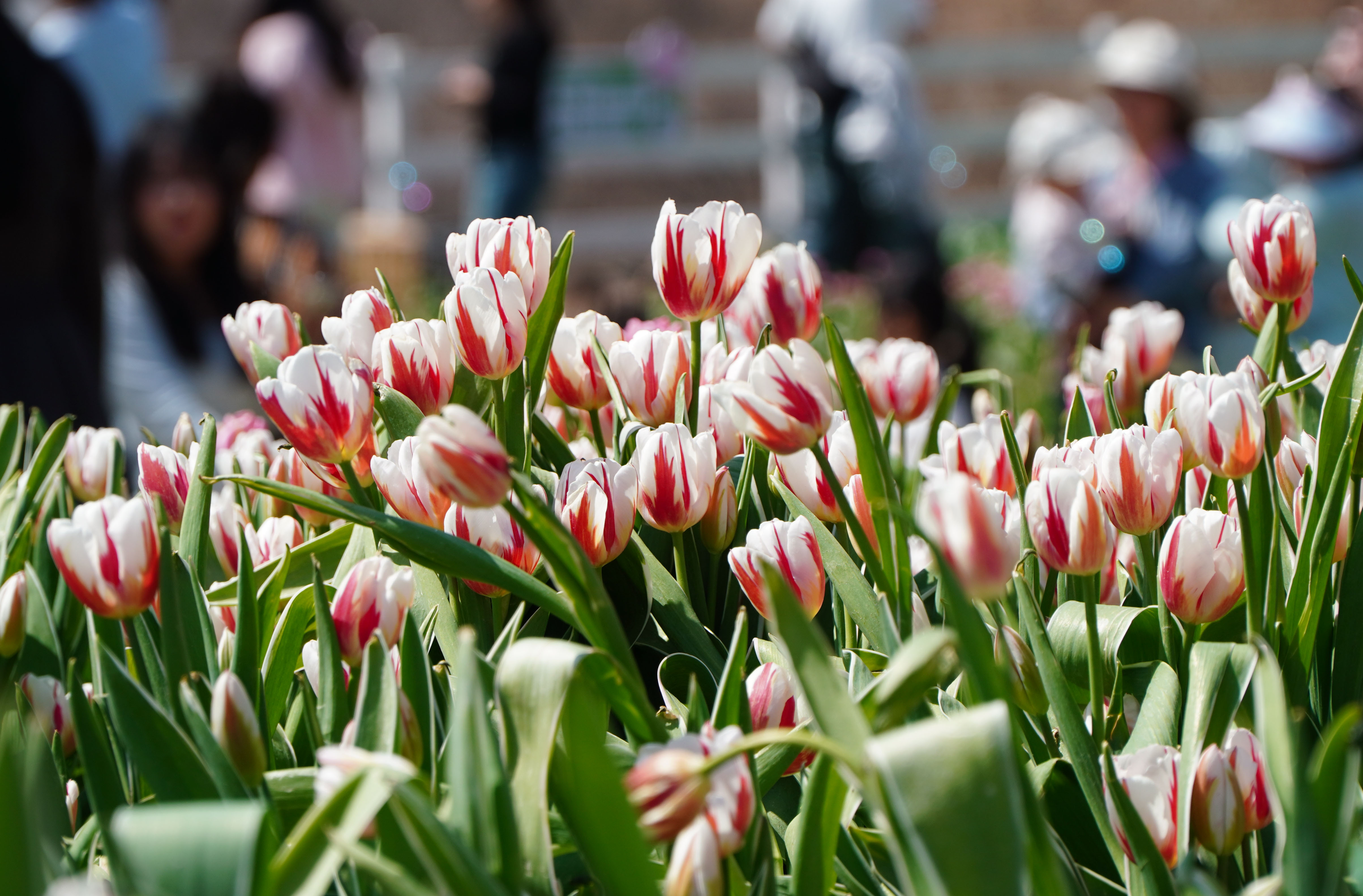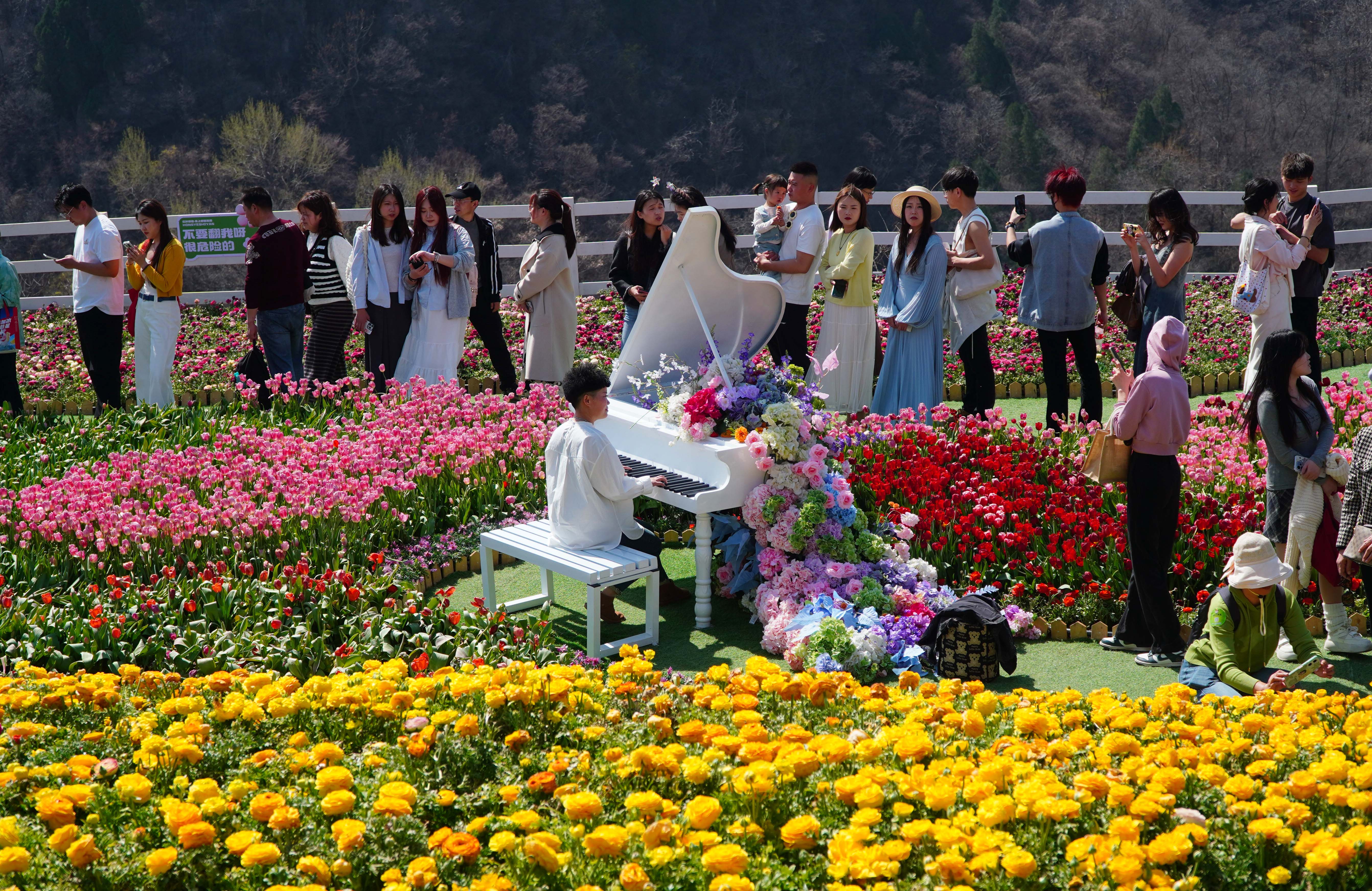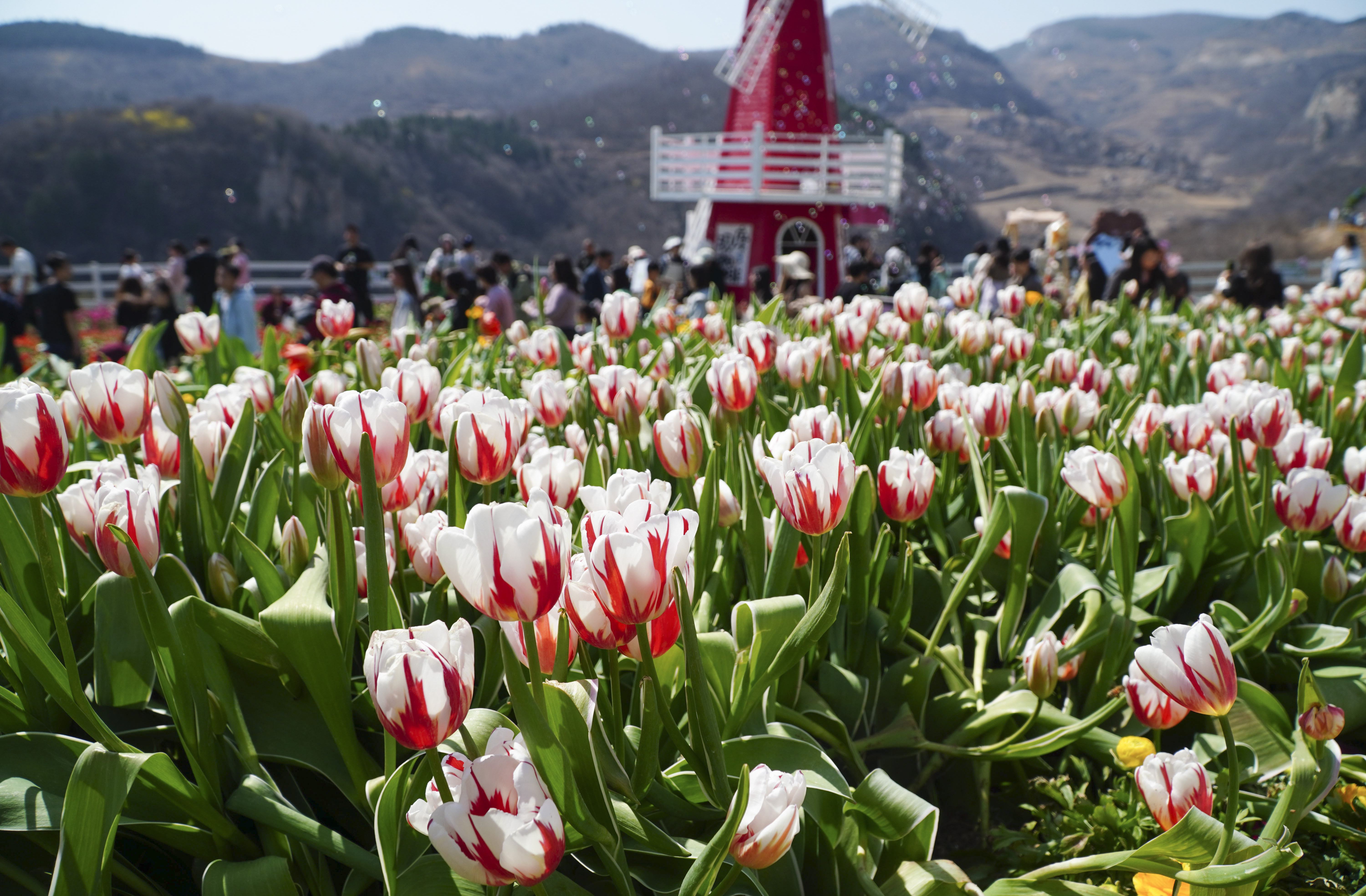 近日,山东省淄博市博山区红叶柿岩景区的郁金香陆续盛开,吸引游客前来赏花踏春。