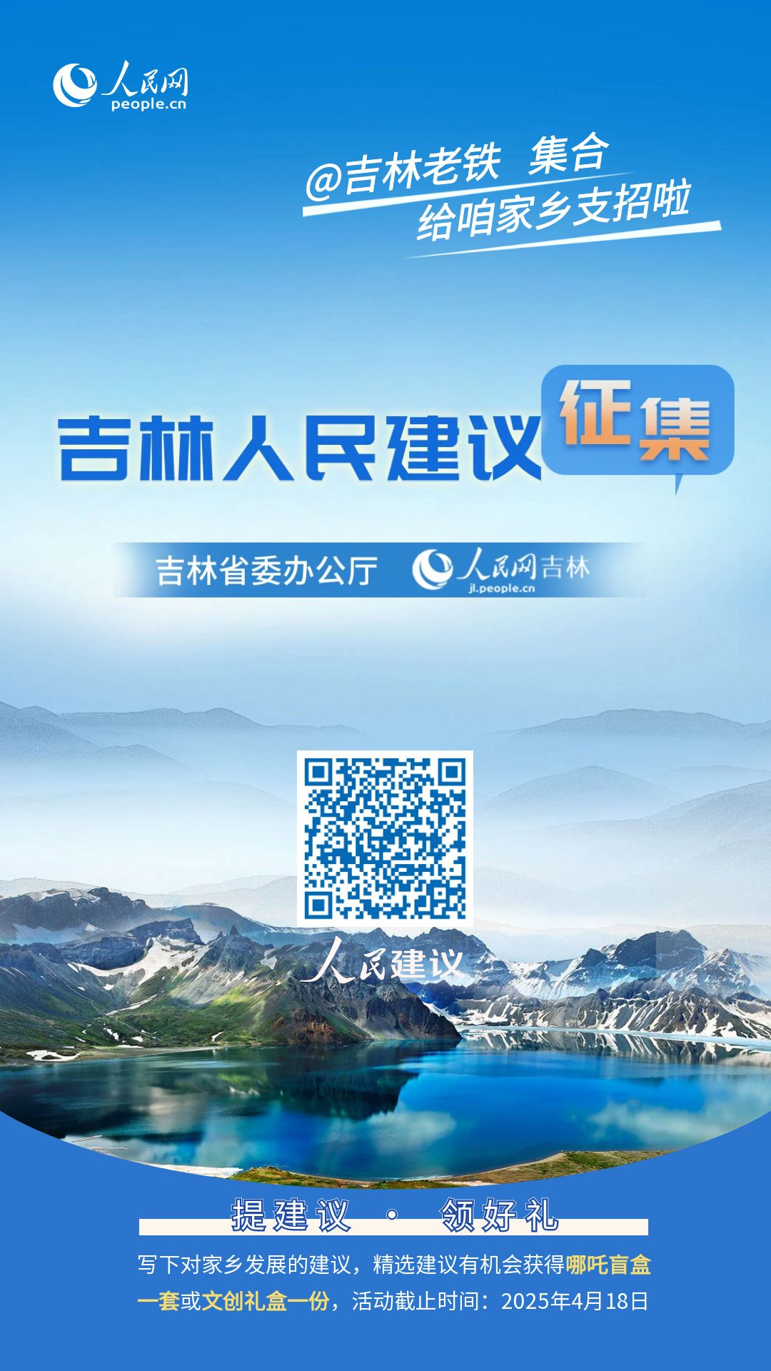 吉林省委办公厅正通过人民网《人民建议》开展“吉林人民建议征集”活动,特邀请吉林人民、吉林女婿/儿媳,刷过吉林美景的驴友,馋着吉林锅包肉的吃货,关注白山松水的家人们!甭管是东北老铁还是南方小土豆,只要心里装着吉林,都希望您来为吉林的发展唠一唠。