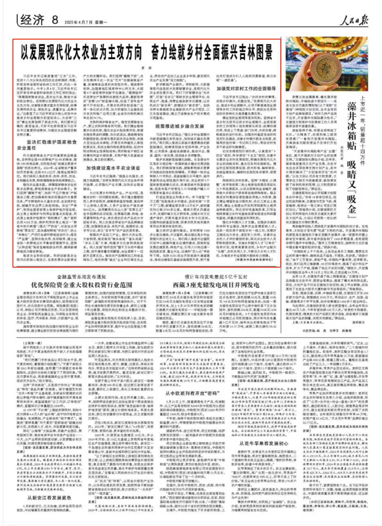 4月7日,《人民日报》8版刊发了吉林省委书记黄强的署名文章《以发展现代化大农业为主攻方向 奋力绘就乡村全面振兴吉林图景》。全文如下: