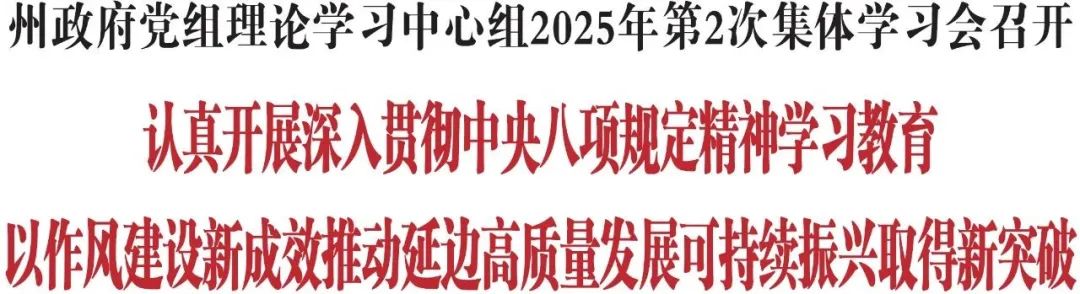 4月9日,州委副书记、州长、州政府党组书记洪庆主持召开州政府党组理论学习中心组2025年第2次集体学习会,深入学习领会习近平总书记关于加强党的作风建设的重要论述和中央八项规定及其实施细则精神,深入学习习近平总书记系列重要讲话精神,落实习近平总书记关于高质量党建引领高质量发展重要要求,以作风建设新成效推动延边高质量发展、可持续振兴取得新突破。