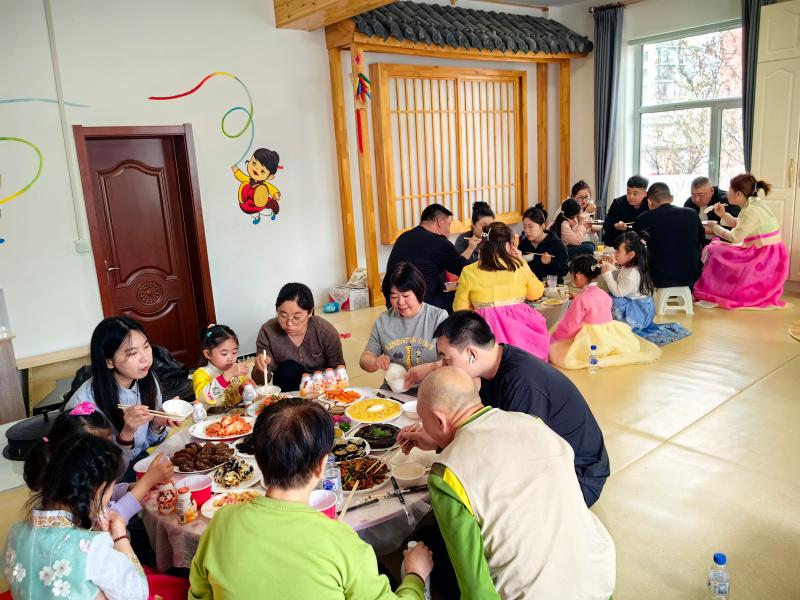 在珲春市河南街道矿泉社区,外地游客在朝鲜族老师的指导下学习长鼓舞及其他民族舞蹈,还亲手制作了紫菜卷等朝鲜族特色美食。定居在珲春的俄罗斯人达尼拉一家也参与其中,与外地游客交流互动。大家围坐一起,制作美食、分享故事,奏响了文化交融的和谐乐章。
