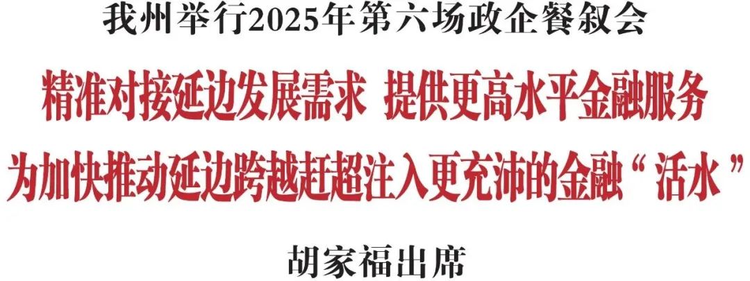 胡家福指出,今天的延边,重大项目量质齐升,产业发展蹄疾步稳,营商环境持续优化,发展态势稳中向好,跨越赶超展现出勃勃生机和光明前景,这为金融机构布局延边、投资兴业提供了广阔舞台和丰厚沃土。希望广大金融机构继续重视延边、深耕延边,大力支持在延分支机构充分发挥作用,持续创新开发金融产品,不断提升金融服务质效,为推动延边高质量发展提供有力金融支撑。要扩大信贷投放规模,定期梳理分析信贷投放行业分布、企业需求结构,通过争取总部专项额度、参与银团贷款等方式,加大资金统筹和投放力度,推动资金向我州重点产业、重点项目、重点企业倾斜,确保更多符合条件的项目获得资金支持、更多企业受益。要创新金融产品供给,立足自身特色与资源优势,持续推出普惠型金融产品和个性化服务,以“量体裁衣”的定制化金融方案破解企业融资痛点,用“触手可及”的普惠金融服务回应群众多元需求,让金融资源更加精准对接发展所需、民生所盼。要推动金融服务精准触达,组织金融服务团队常态化深入县市、园区,通过实地走访、政策宣传等方式对接企业融资需求、广泛传递政策利好,确保金融政策直达基层、金融资源精准落地,让企业和群众享受更便捷、更高效、更优质的金融服务。延边州委、州政府将始终秉持彼此成就、互利双赢的理念,持续优化金融生态环境,积极搭建银企合作平台,为广大金融机构在延开展业务创造更好条件,努力实现地方经济与金融发展的互利共赢。