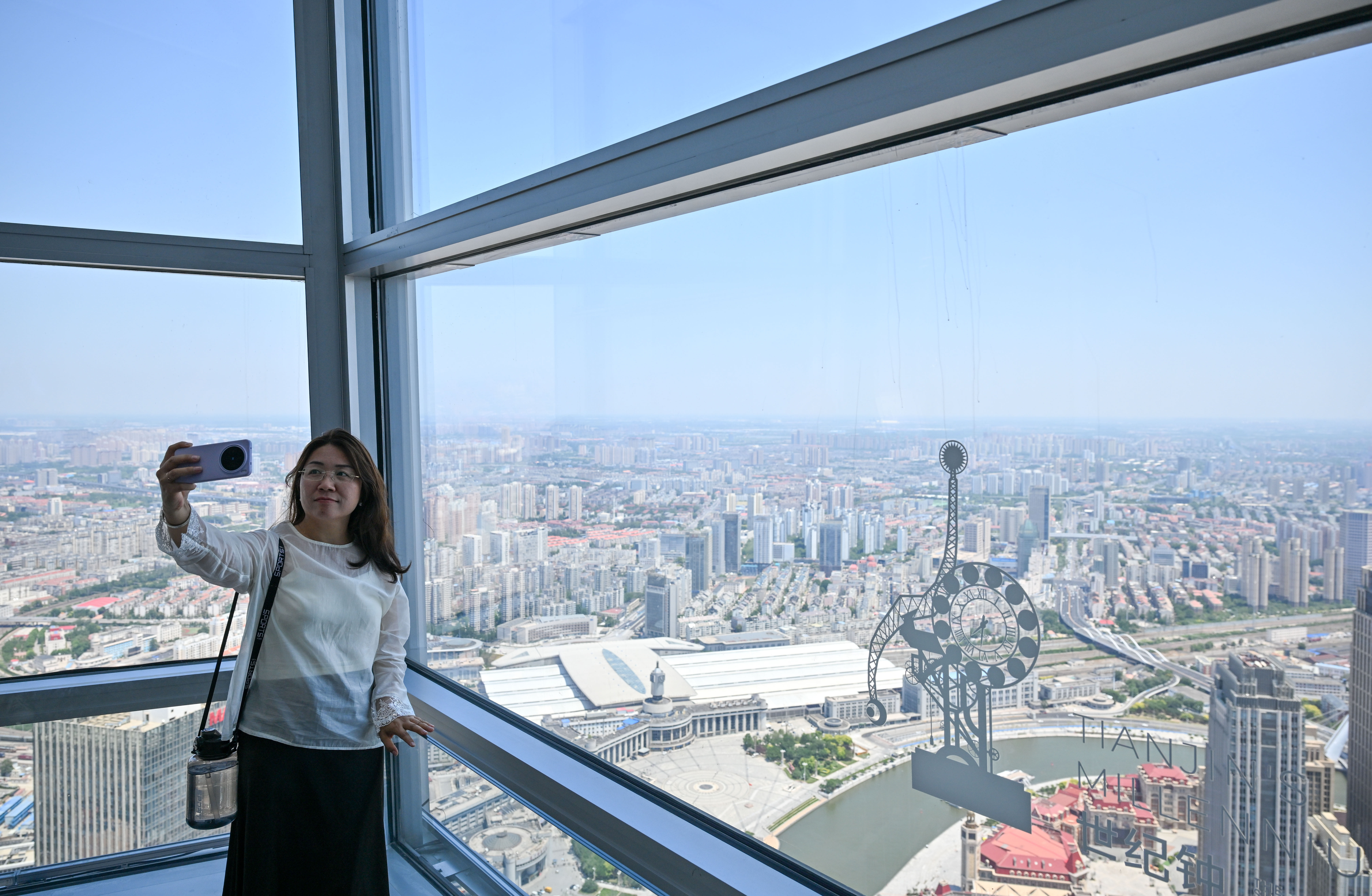 6月22日,位于天津环球金融中心79层的“天津之心”津塔观光厅正式对外开放,市民游客可在310米的高度,360度全景欣赏天津的城市魅力。