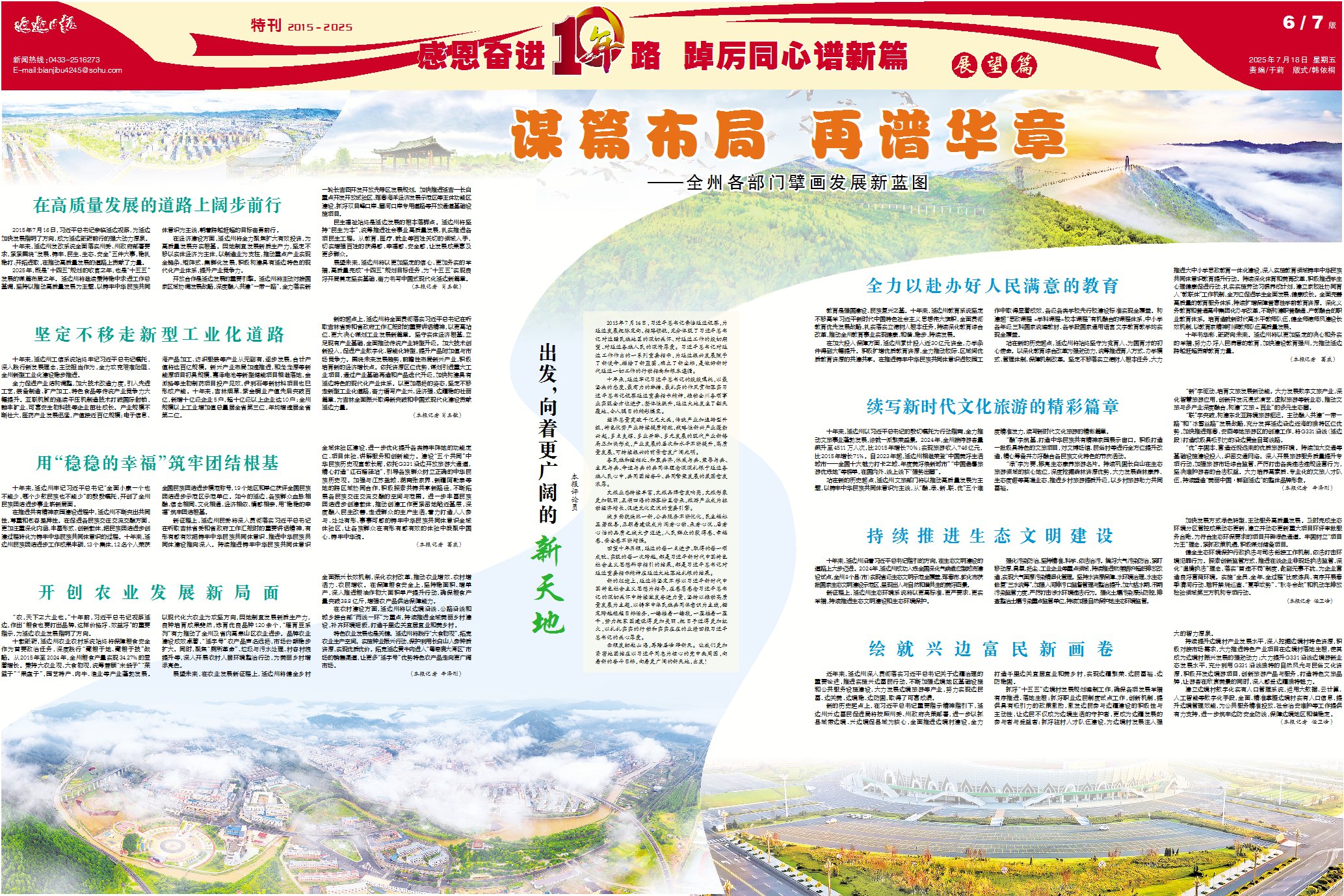 发展没有终点,实践不会止步。本报今日推出“感恩奋进十年路 踔厉同心谱新篇”主题特刊之“展望篇”,展示各县(市)、各部门强化使命担当、保持战略定力,聚焦服务国家发展战略,紧扣州委、州政府决策部署,凝心聚力、接续奋斗,奋力书写中国式现代化延边新篇章的坚定信心和务实举措。