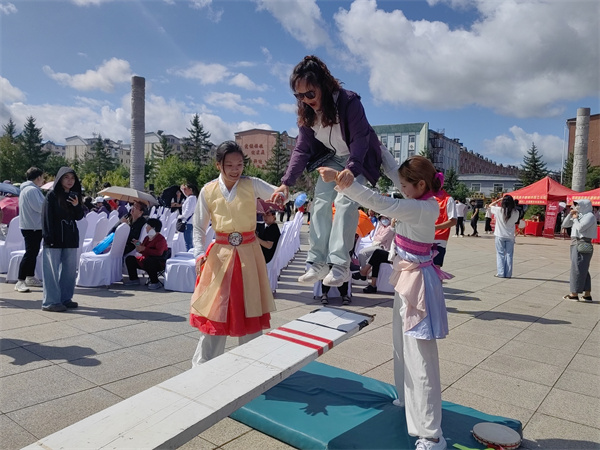 活动现场,传统体育项目展示区成为市民关注的焦点。朝鲜族跳板表演者身姿轻盈、起伏腾跃,引得观众连连喝彩,不少市民踊跃参与体验,感受这项传统运动的惊险与刺激;朝鲜族摔跤则展现了力量与技巧的完美结合,选手们精湛的技艺和顽强的拼搏精神赢得阵阵掌声。同时,民族健身操、武术等节目也轮番上演,充分彰显了中华传统体育文化的魅力与活力。