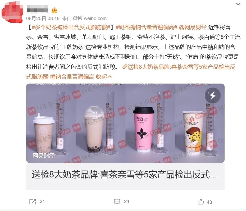 “奶茶中检出反式脂肪酸,不能喝了,对身体有害。”