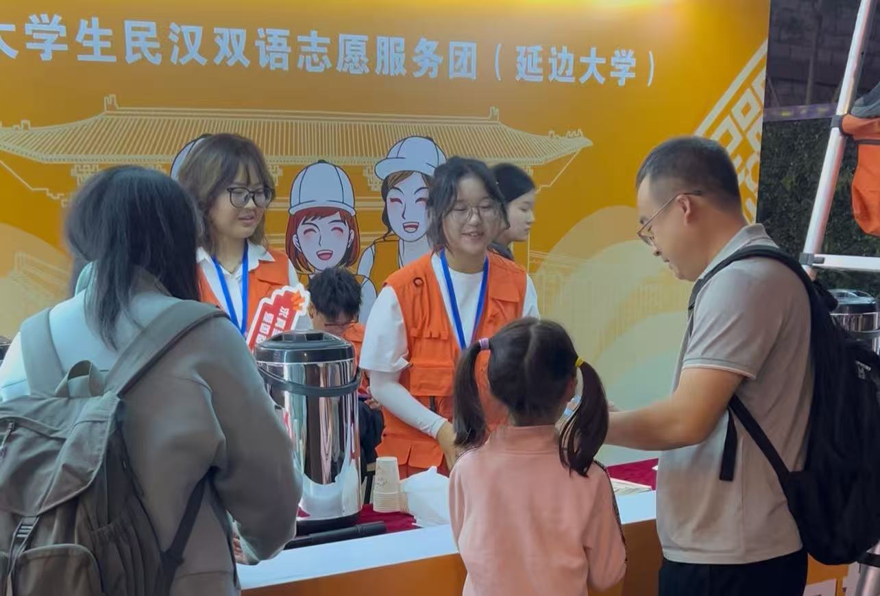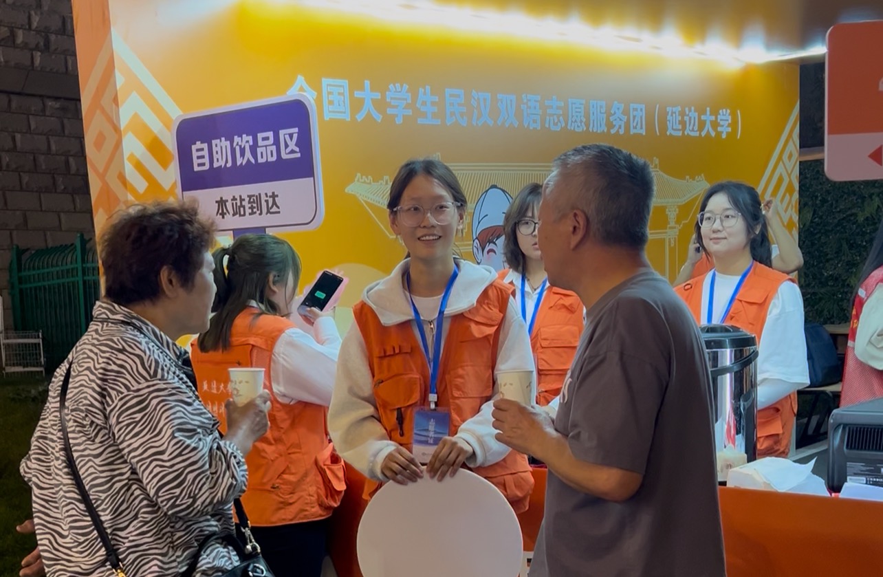 9月30日,记者在延吉西站与延边大学正门看到,活动主办方在这两处分别设立“志愿红”“活力橙”暖心服务站,多名志愿者身着红、橙马甲,分工有序地为游客提供暖心茶水、交通指引、手机充电、文旅咨询等多项贴心服务。“下雨了,送您一件雨衣,祝您在延边玩得开心。”“活力橙”志愿者李娜是延边大学师范学院2022级小学教育专业学生,当天不仅为游客送去雨衣,还贴心地为老年游客倒上温热的饮用水,反复叮嘱大家雨天路滑,行走与拍照时需注意安全。
