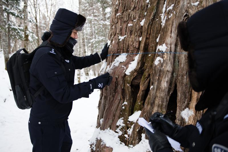 行至汪清林区荒沟林场63林班,沿着山路拾级而上,风吹在脸上犹如刀割,顺着大衣领口直冲身体,民警们深一脚浅一脚地前行,积雪顺着鞋口灌进鞋内,一股凉气瞬间从脚掌传遍全身。事实上,民警们习惯了这样恶劣的天气,滑倒,就爬起来,手冻麻了,摘下手套呼一口热气暖一暖……半小时后,一棵3000多年的红豆杉展现在我们面前,20余米的身躯直冲云霄,1.68米的胸径环抱年轮,历经千年岁月依然屹立挺拔,这棵红豆杉需五个成年人才能环抱过来。即便在冬日,枝叶仍倔强地保持着翠绿,与洁白的雪相互映衬,构成了一幅绝美的画卷。