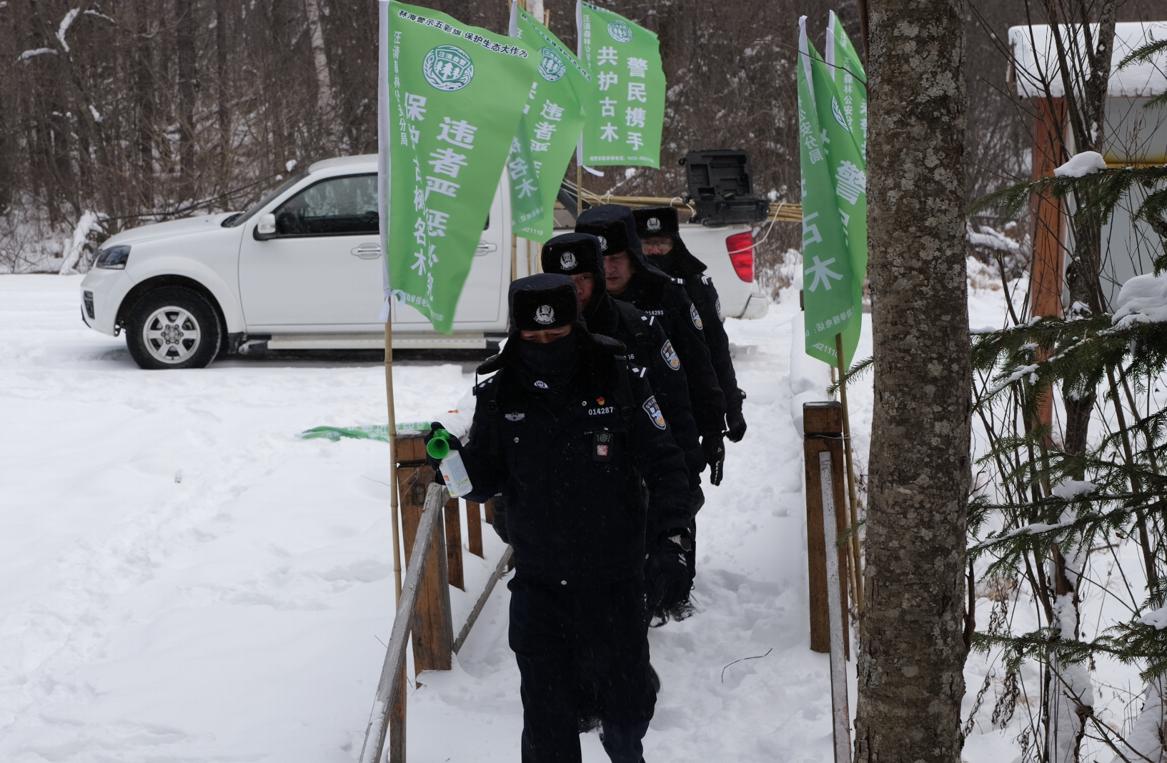 12月初的一场降雪,覆盖了汪清广袤的林区。水墨山林,一抹藏蓝穿梭其间,那是省公安厅森林公安局汪清森林公安分局金苍森林派出所的民警们正在巡山。此行的目的是巡护一棵3000多年的红豆杉是否被雪压断树枝和遭到人为破坏及生长情况,再悬挂保护古树保护条幅和标语。