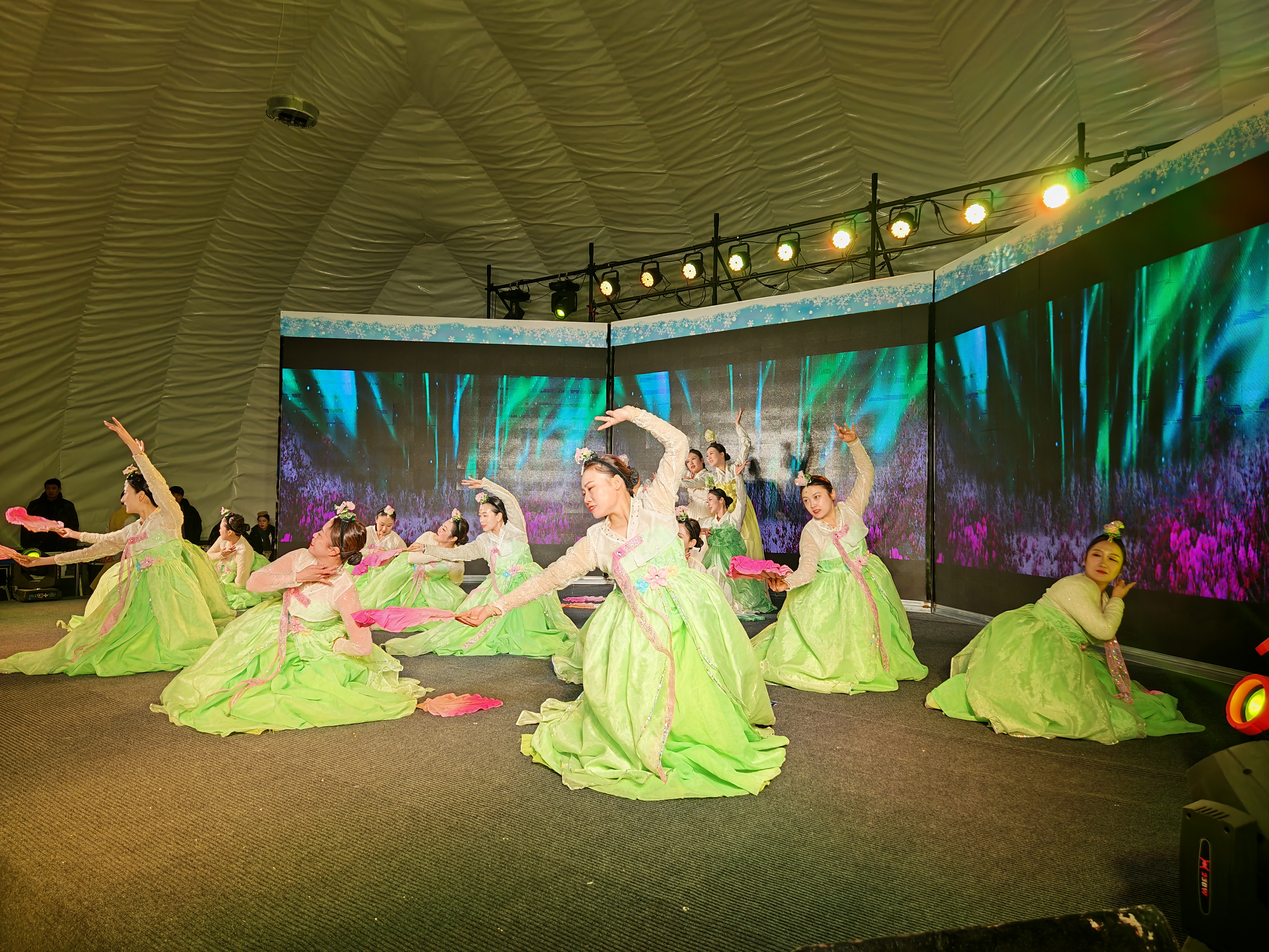 清晨的仙峰老里克景区,-20℃的气温挡不住如火的热情。当日9时,启动仪式在《红太阳照边疆》专场演出中拉开帷幕,中国朝鲜族农乐舞、象帽舞等非遗项目轮番上演,融合中国朝鲜族传统歌舞、声乐、曲艺等多种艺术形式,为现场观众呈现了一场震撼心灵的视觉盛宴。