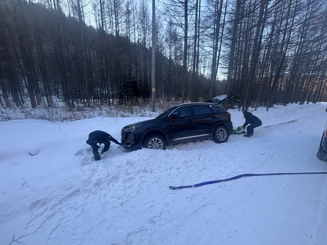 1月18日9时许,沙金沟森林派出所在巡逻过程中,发现一辆私家车在途经金沟岭林场至地阴沟林场沿线时,由于车速过快且路面结冰,存在浮雪导致车辆打滑,车辆不慎冲入路边排水渠中,车身倾斜过半,车轮深陷排水渠积雪中,无法自行脱困。发现这一情况后,民警一边安抚被困群众的情绪,详细询问人员情况及车辆型号,一边帮助其寻找车辆拖车钩所在位置并安置拖车绳。经现场勘查,被困车辆右侧两轮完全陷入排水渠,底盘卡于沟沿,排水渠内积雪覆盖深厚,由于现场没有工具,民警徒手奋力刨除车轮周边的积雪,清理出作业空间,同时引导车主配合调整方向盘、控制油门,开始使用警车对被困车辆实施救援拖拽。经过30余分钟的紧张施救,被困车辆成功被牵引至安全路面,民警确认车辆无机械故障后叮嘱车主雪天行车务必降低车速,获救车主握住民警的手连连感谢:“多亏了你们,这荒郊野外的也没有手机信号,要不我真不知道该怎么办好了!”