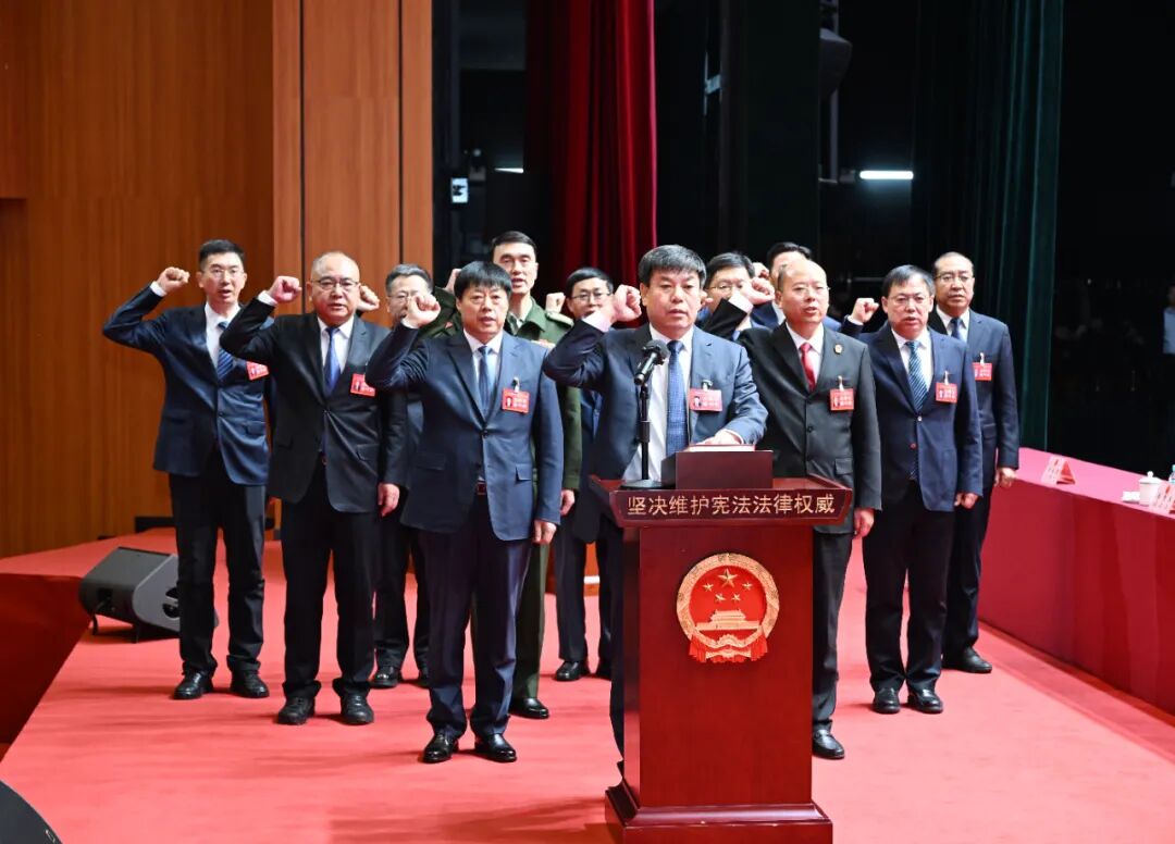 在代表们热烈的掌声中,新当选的州十六届人大常委会副主任、委员、州人大专门委员会主任委员,州监察委员会主任,州中级人民法院院长到主席台前与代表见面,并进行宪法宣誓。