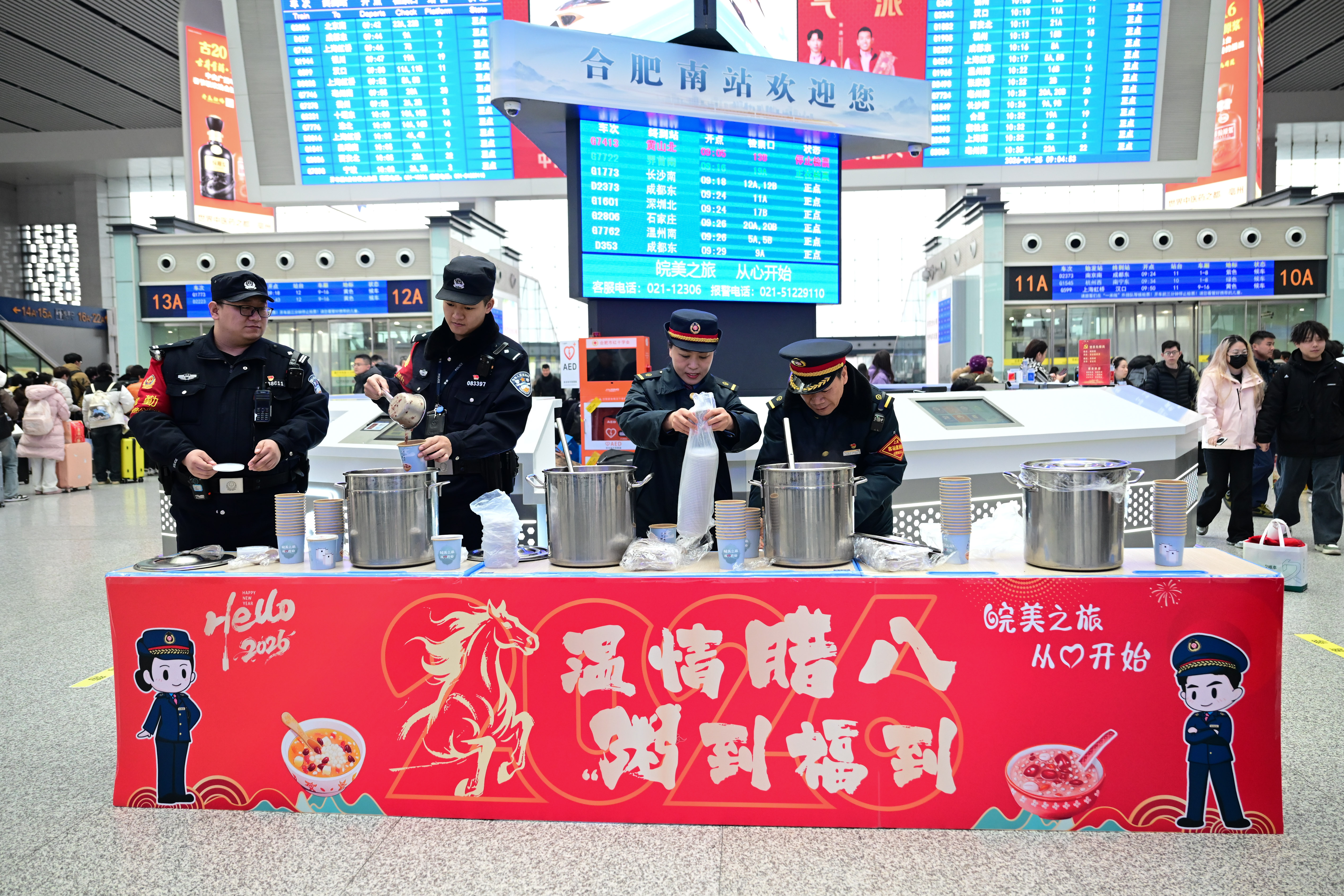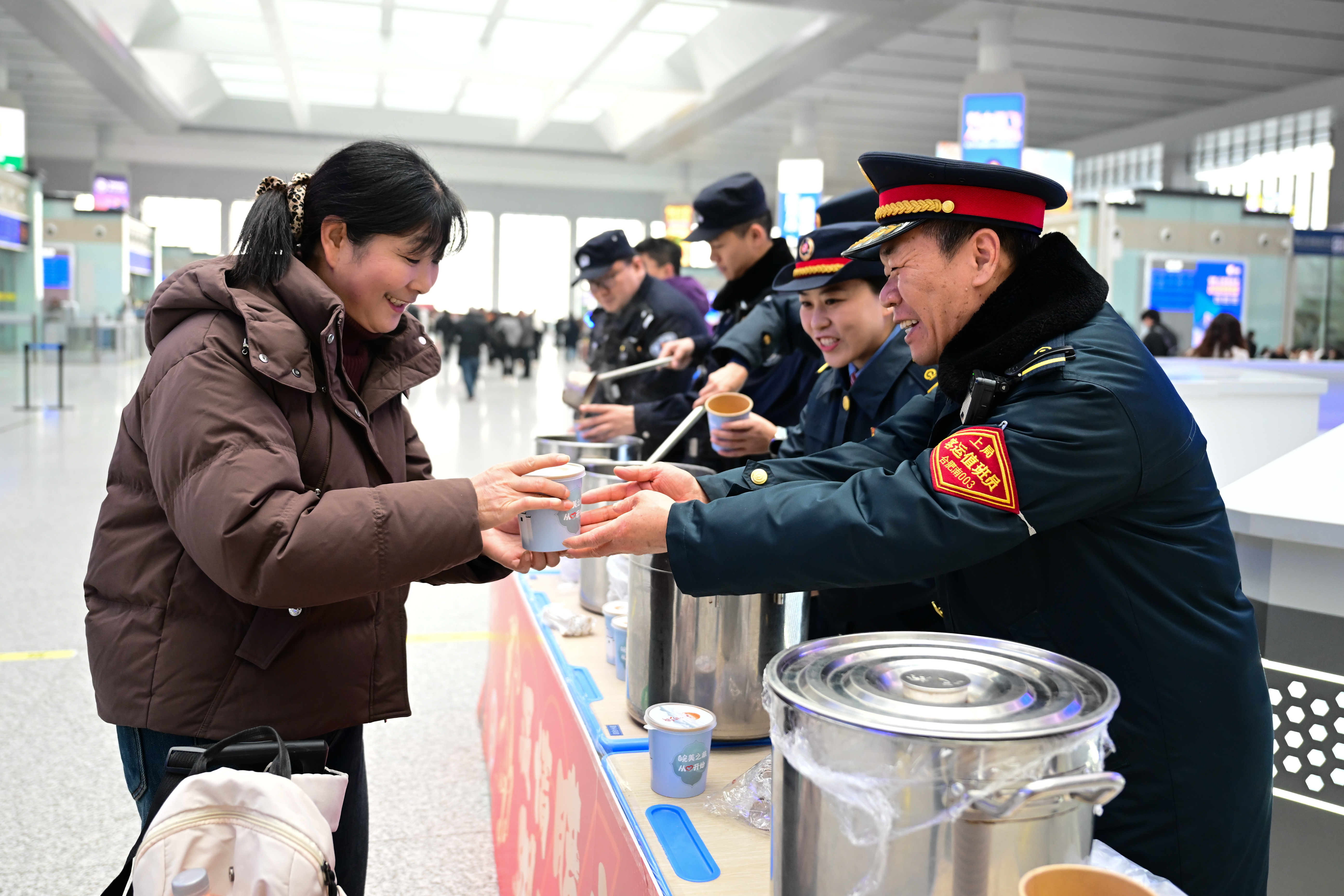 腊八节即将到来之际,一场“温情腊八 粥到福到”活动在安徽省合肥南站候车大厅内举办,车站工作人员将一碗碗热气腾腾的腊八粥送到旅客手中,让旅客在旅途中感受浓浓温情。