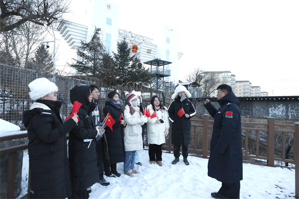 活动首站,学生们走进图们边检站警史馆,在一张张历史照片、一面面荣誉锦旗、一段段奋斗故事前驻足凝视,感受着移民管理队伍的发展变迁与使命担当。随后,学生们来到图们国门与国境桥梁。凛冽寒风中,学生们在执勤民警的带领下,实地踏查边境巡逻路线。穿过边境通道,学生们抵达中朝86号界碑。