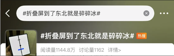 近日,“折叠屏到了东北就是‘碎碎冰’”的消息,登上微博热搜。