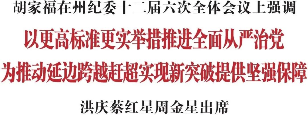 2月2日,中国共产党延边朝鲜族自治州第十二届纪律检查委员会第六次全体会议在延吉召开。省委常委、州委书记胡家福出席会议并讲话。他强调,要深入学习贯彻习近平总书记关于党的自我革命的重要思想,按照二十届中央纪委五次全会和省纪委十二届五次全会的部署要求,聚焦打造“一极、两地、三区”目标任务,以更高标准、更实举措推进全面从严治党,持续巩固发展风清气正的政治生态和干事创业的良好氛围,为推动延边跨越赶超实现新突破提供坚强保障。州委副书记、州长洪庆,州人大常委会主任蔡红星,州政协主席周金星出席会议。