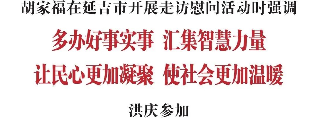 在延边大学,胡家福看望了延边大学副校长、教授孙俊奇和延边大学附属医院心血管内科主任、教授成宪武,向他们致以新春祝福。胡家福说,推动延边跨越赶超,离不开专家人才的智力支持。希望孙俊奇、成宪武两位专家在本岗位本领域深耕细作、潜心研究,勇攀科技高峰,破解发展难题,努力取得更多更好的科研成果,积极推动更多学术成果在延落地转化,为全州经济社会发展作出更大贡献。全州各级党委、政府要坚持把人才工作置于更加突出位置,着力提供高效、便捷、贴心服务,用心用情打造“拴心留人”的良好环境,营造尊重劳动、尊重知识、尊重人才、尊重创造的浓厚氛围,让各类人才在延边这片发展沃土上施展才华、建功立业。