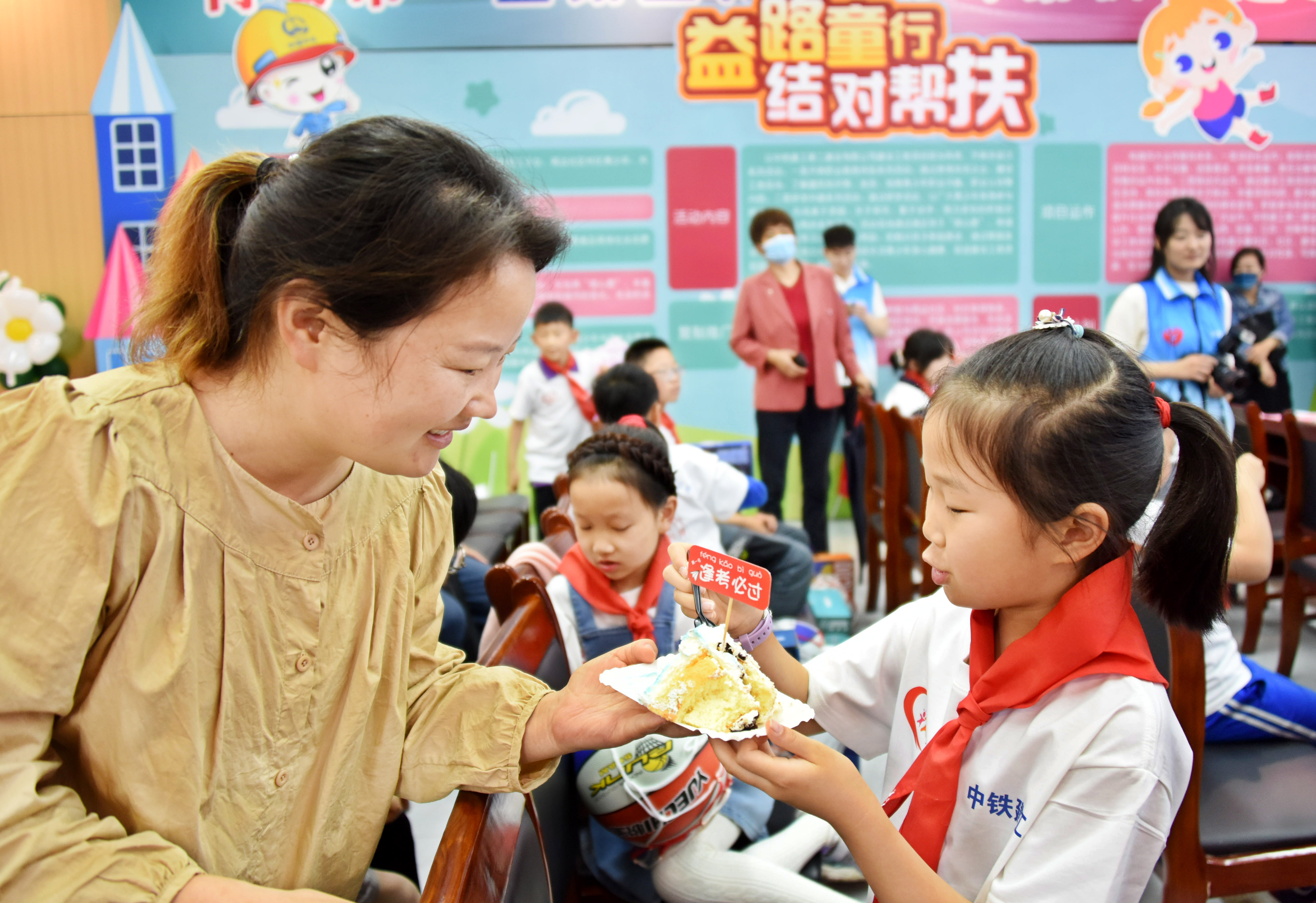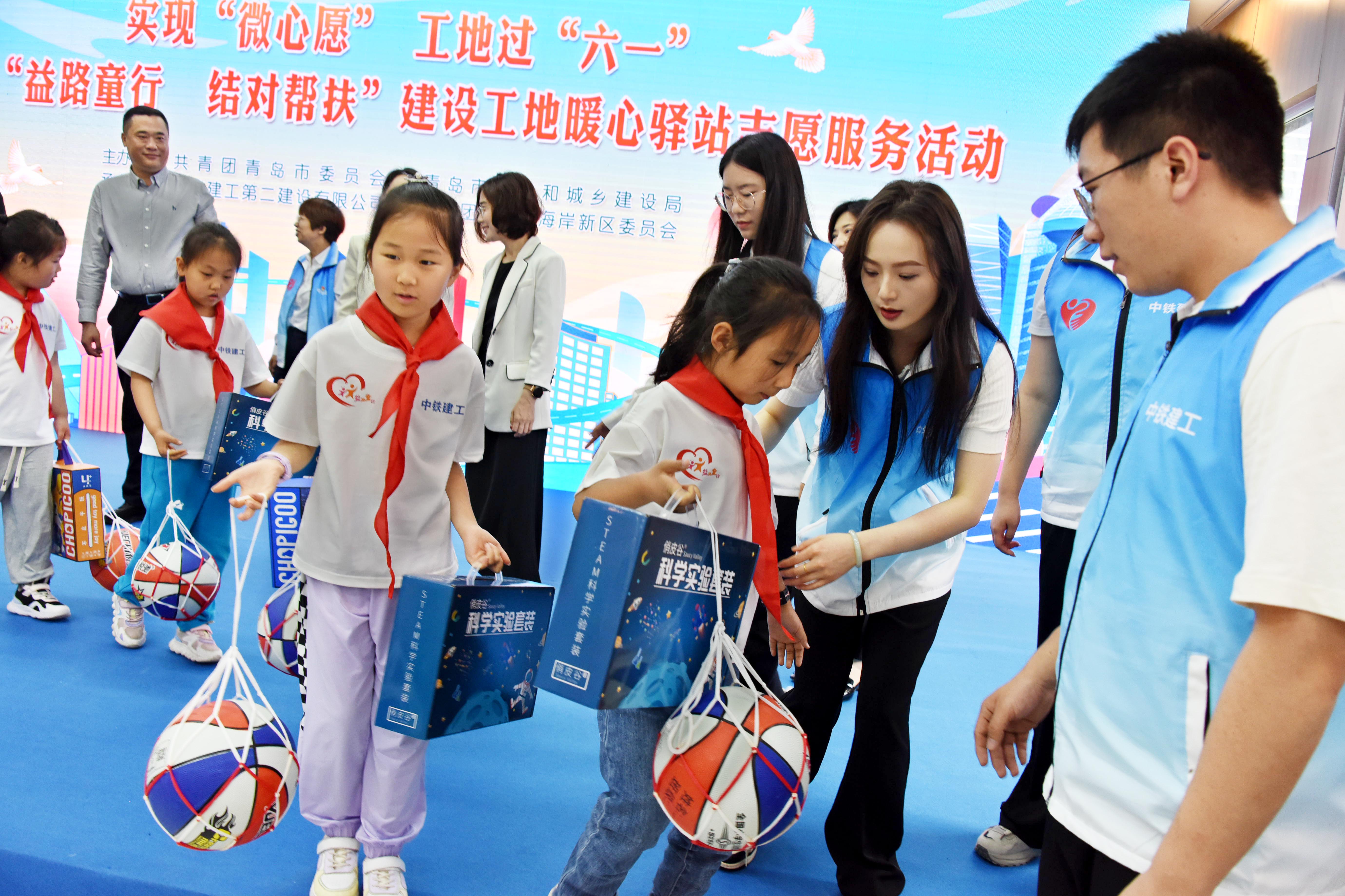 5月28日,由共青团青岛市委发起的“益路童行 结对帮扶”建设工地暖心驿站志愿服务活动举行。来自中铁建工“筑梦”志愿服务队的志愿者们,与少年儿童结成帮扶对子,为他们表演节目并准备礼品和蛋糕,在联欢中迎接“六一”的到来。