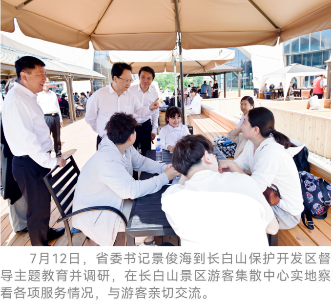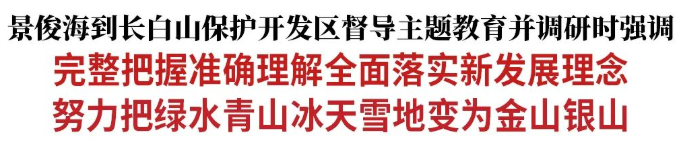 7月12日,省委书记景俊海到长白山保护开发区督导主题教育并调研。他强调,要忠实践行习近平生态文明思想,坚持保护生态和发展生态旅游相得益彰,完整把握、准确理解、全面落实新发展理念,努力把绿水青山、冰天雪地变为金山银山,为建设生态强省、加快振兴发展作出新的更大贡献。