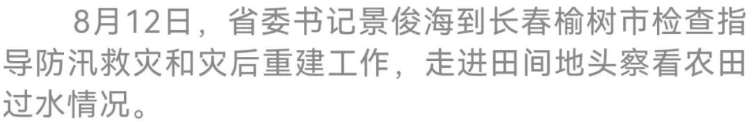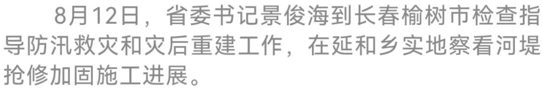 今天(8月12日),省委书记景俊海再次来到长春榆树市,实地检查指导防汛救灾和灾后重建工作。他强调,要深入贯彻习近平总书记关于防汛救灾工作的重要指示精神,认真落实李强总理要求,始终坚持人民至上、生命至上,坚决打赢防台风防汛主动仗,众志成城恢复重建美好家园,奋力夺取防汛救灾和灾后重建全面胜利。