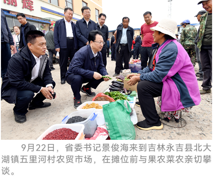 9月23日是第六个“中国农民丰收节”。9月22日,省委书记景俊海,省委副书记、省长胡玉亭分别来到吉林永吉县和长春德惠市,深入田间地头、乡镇集市,全面落实习近平总书记在第六个“中国农民丰收节”到来之际作出的重要指示精神,与农民群众共话丰年、共庆丰收,向全省广大农民和工作在“三农”战线上的同志们致以节日祝贺和诚挚慰问。