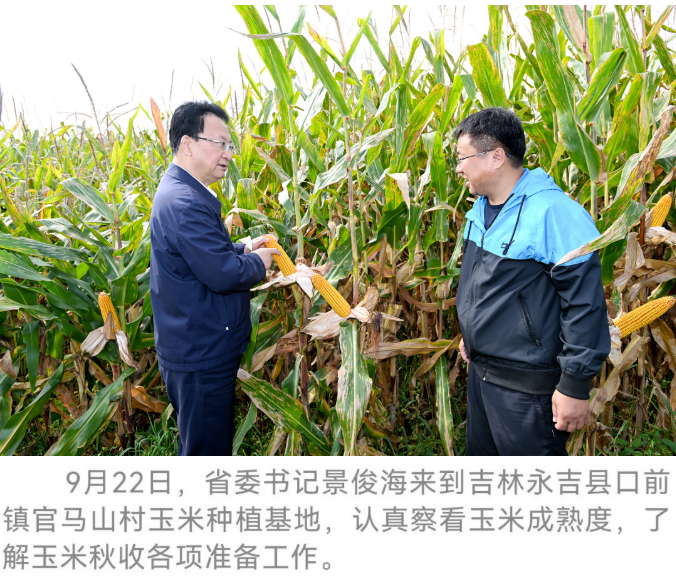 景俊海来到旁边的玉米种植基地,认真察看玉米成熟度,叮嘱当地干部做好玉米秋收各项准备,确保过程安全高效、粮食颗粒归仓。景俊海要求各级党委政府聚焦建设农业强省目标,着力稳住农业基本盘,争当现代农业建设排头兵。要培育更多农产品初加工和精深加工项目,进一步延伸产业链、提升价值链,为乡村全面振兴提供产业支撑。要扎实推进秸秆综合利用,严格执行秸秆全域禁烧,切实保护好吉林的绿水青山黑土地、蓝天白云好空气。