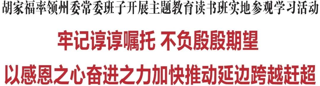 9月25日,省委常委、州委书记胡家福率领州委常委班子开展主题教育读书班实地参观学习活动,现场体悟习近平新时代中国特色社会主义思想的真理力量和实践伟力。他强调,要深入贯彻习近平总书记视察吉林视察延边重要讲话重要指示精神,牢记谆谆嘱托,不负殷殷期望,以感恩之心、奋进之力加快推动延边跨越赶超。