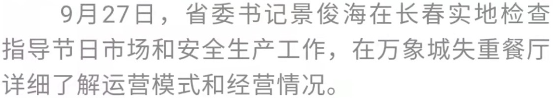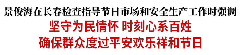 今天(9月27日),省委书记景俊海在长春实地检查指导节日市场和安全生产工作。他强调,要深入贯彻习近平总书记关于安全生产和扩大内需的重要论述,全面对标对表习近平总书记在新时代推动东北全面振兴座谈会上的重要讲话精神,坚守为民情怀,时刻心系百姓,扎实做好安全生产工作,进一步丰富市场供应、稳定商品价格、满足消费需求,确保群众度过平安欢乐祥和节日。红旗青年荟商场聚集了200多家品牌商户,主要面向青年消费群体开展经营。景俊海走访察看运营情况,看到文创产品特别受欢迎、商家营销方式十分灵活,给予充分肯定。景俊海强调,资源有限、创意无限。要深入研究市场,主动引领需求,大力推进文旅商融合发展,以文化创新、业态创新、模式创新提升产品服务价值,吸引各地游客,带动商业繁荣。景俊海随机走进一家餐馆后厨,仔细察看卫生条件和燃气使用情况,要求有关部门加强食品安全监管和燃气安全检查,严格排查整治风险隐患,坚决守住安全底线。在商场中央控制室,景俊海认真察看消防设施运行情况,强调要坚持人防技防相结合、巡查监控相结合,严格落实安全措施,加强消防设施维护和应急演练,在显眼处设置紧急通道标识,一旦发生危险必须第一时间疏散,确保人民群众生命安全。长春万象城客流如织、人气火爆,是城市新晋网红打卡地。景俊海来到0LE超市,详细了解蔬菜、水果、副食等商品供应情况,要求有关部门组织商场与当地货源对接,统筹线上线下渠道,更好帮助吉林特色农产品拓展销路、抢占市场。失重餐厅是一家无人点餐、无人送餐、无人收银餐厅。景俊海详细了解独特运营模式,强调要以创新赋能传统业态,不断为群众提供新服务、创造新体验,更好地满足群众多样化需求。调研中,景俊海指出,中秋、国庆双节临近,各地、各部门要保持“时时放心不下”的责任感,扎实做好节日期间各项工作,坚决维护全省社会大局安全稳定。要聚焦煤矿和非煤矿山、道路交通、危化品、森林草原防火、旅游景区等重点领域,进一步加强风险防范措施,坚决防止重特大事故发生。要聚焦百姓“菜篮子”“米袋子”“果盘子”,切实保障节日市场供应充足、价格稳定,让百姓节日餐桌更加丰盛。要聚焦消费扩容提质,积极开展吉林旅游营销推广,进一步丰富文化文艺活动,鼓励商场店铺开展节日促销,千方百计扩大内需、拉动消费,为经济稳定增长注入强劲动力。