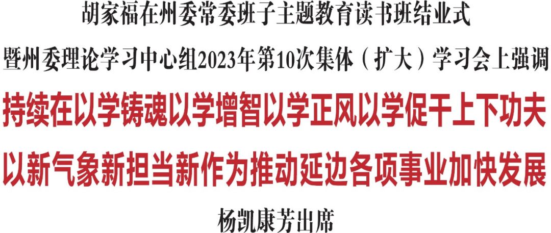 10月20日,省委常委、州委书记胡家福主持召开州委常委班子学习贯彻习近平新时代中国特色社会主义思想主题教育读书班结业式暨州委理论学习中心组 2023年第10次集体(扩大)学习会。他强调,要深入学习、深刻领悟习近平新时代中国特色社会主义思想,持续在以学铸魂、以学增智、以学正风、以学促干上下功夫,以新气象新担当新作为推动延边各项事业加快发展。省委第二巡回督导组组长杨凯,州政协主席康芳出席会议。