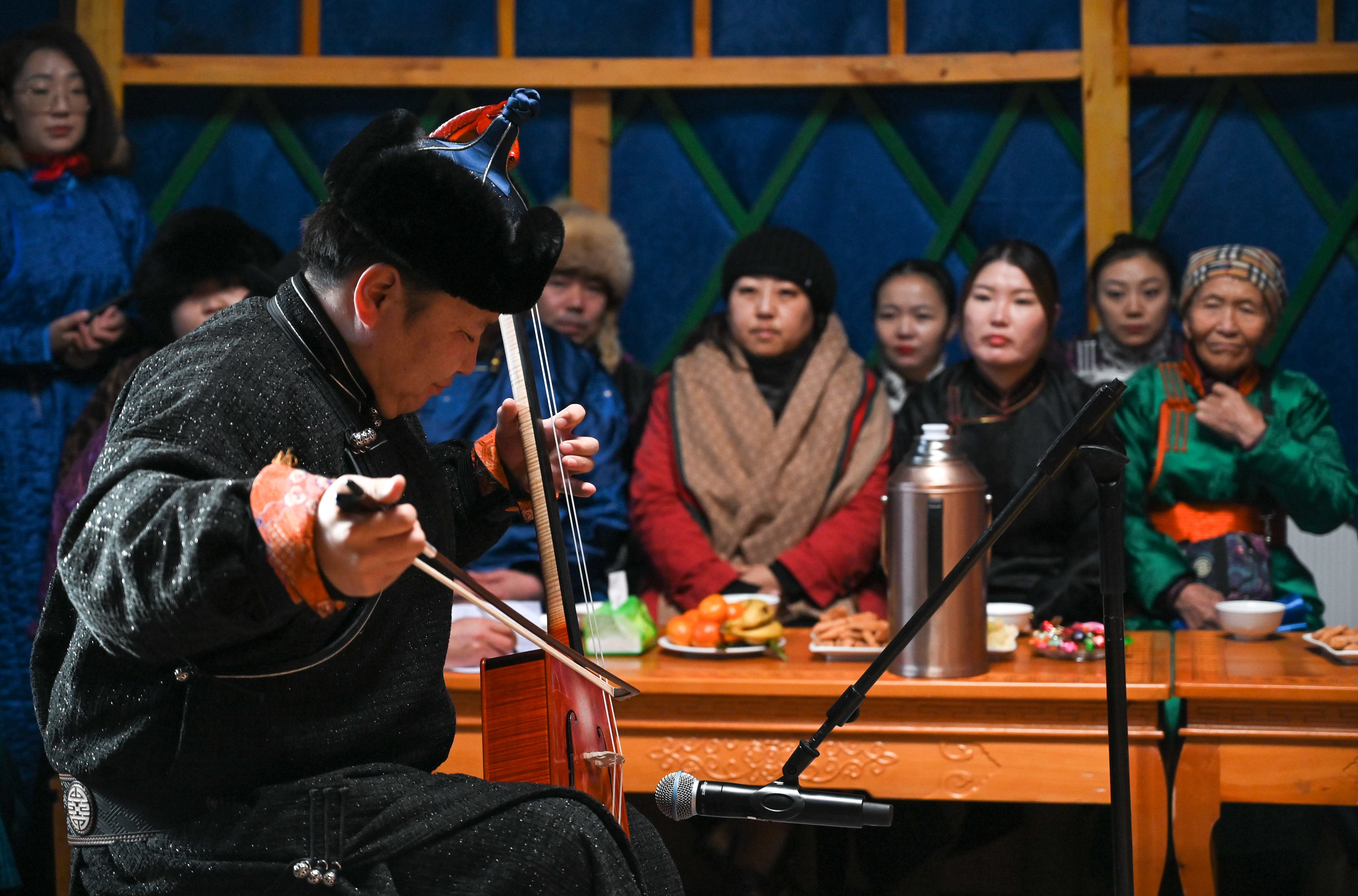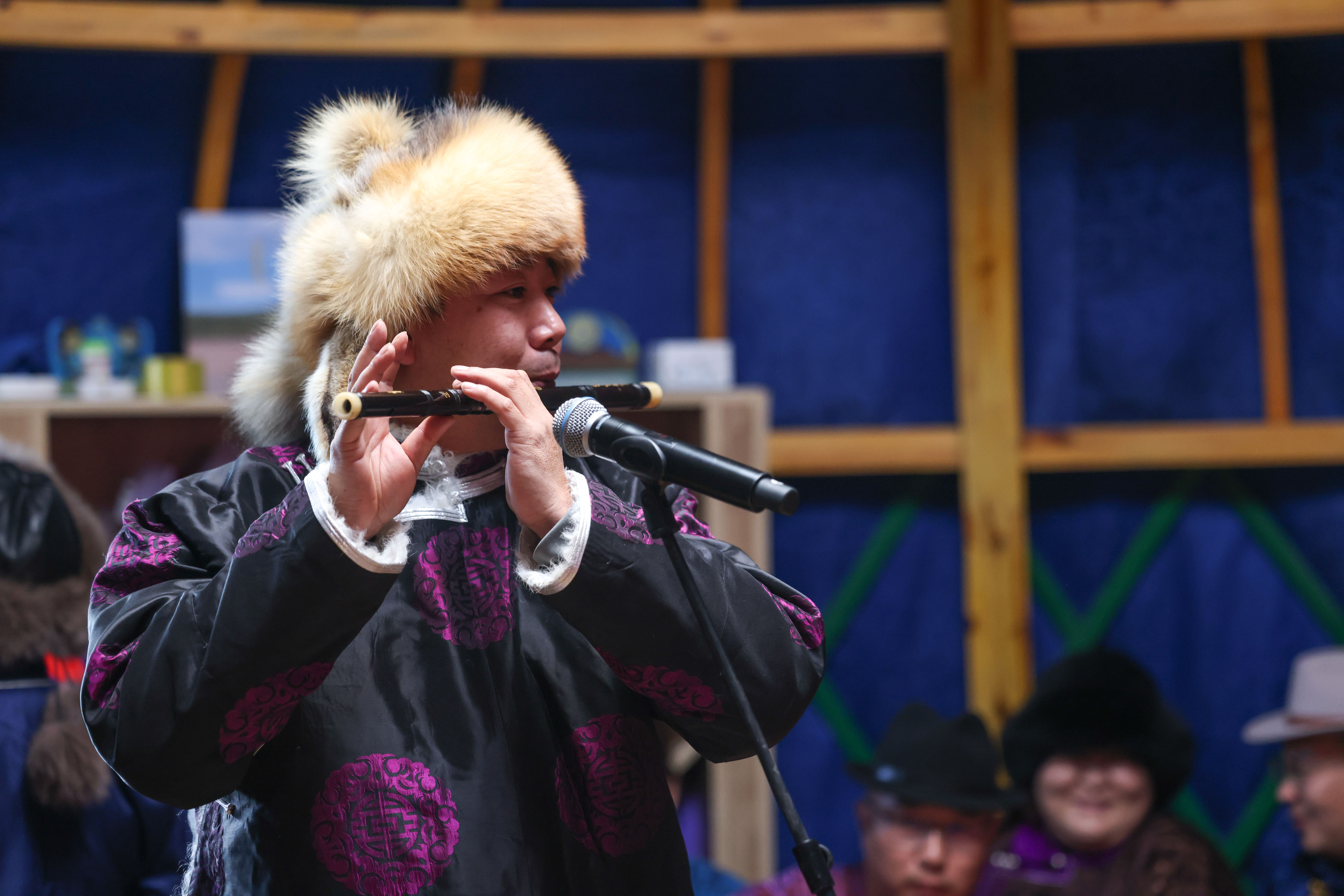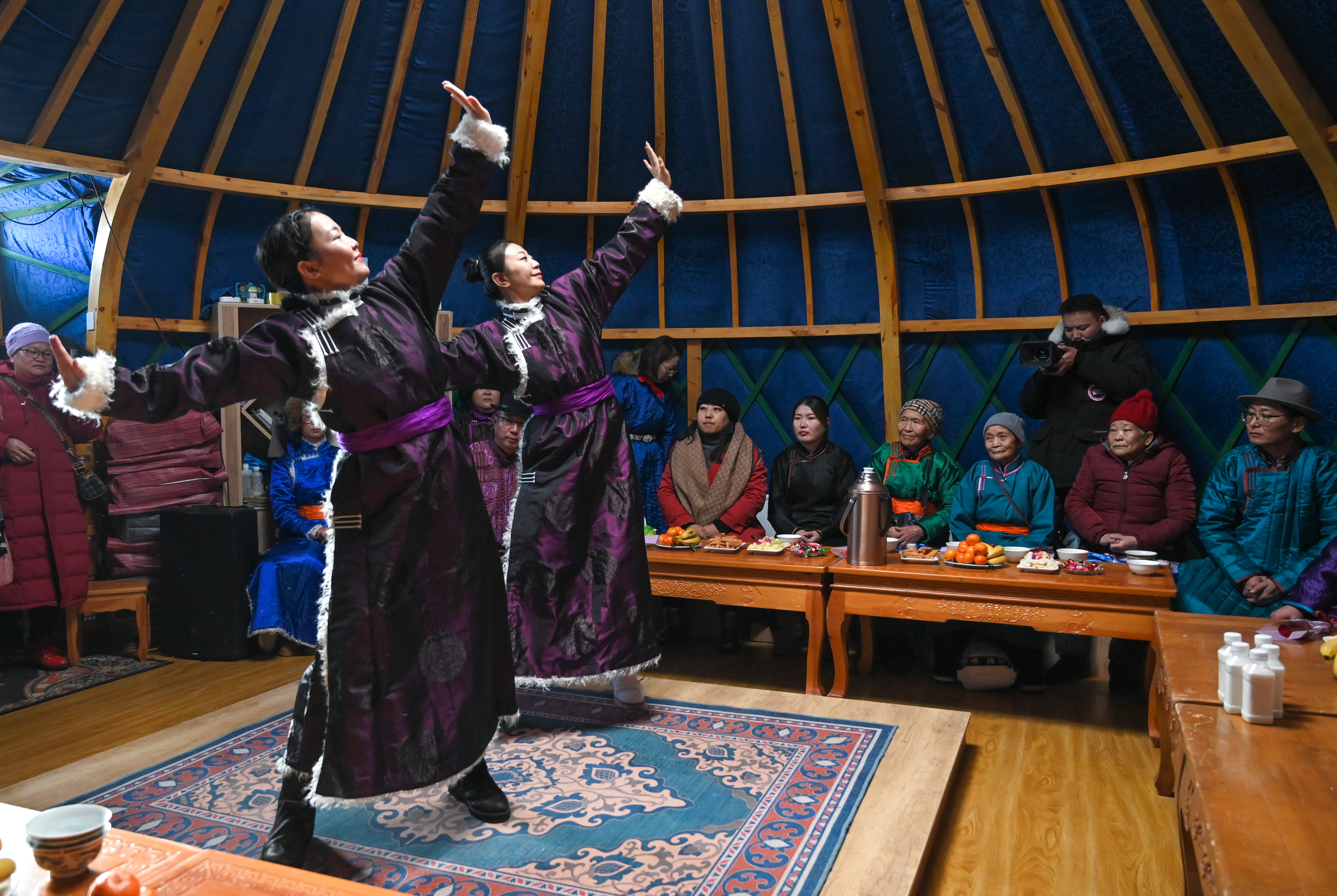 冬日里,内蒙古锡林郭勒盟苏尼特右旗乌兰牧骑的队员来到阿其图乌拉苏木,为当地牧民送去独具特色的文艺表演,也为冬日的草原增添色彩。
