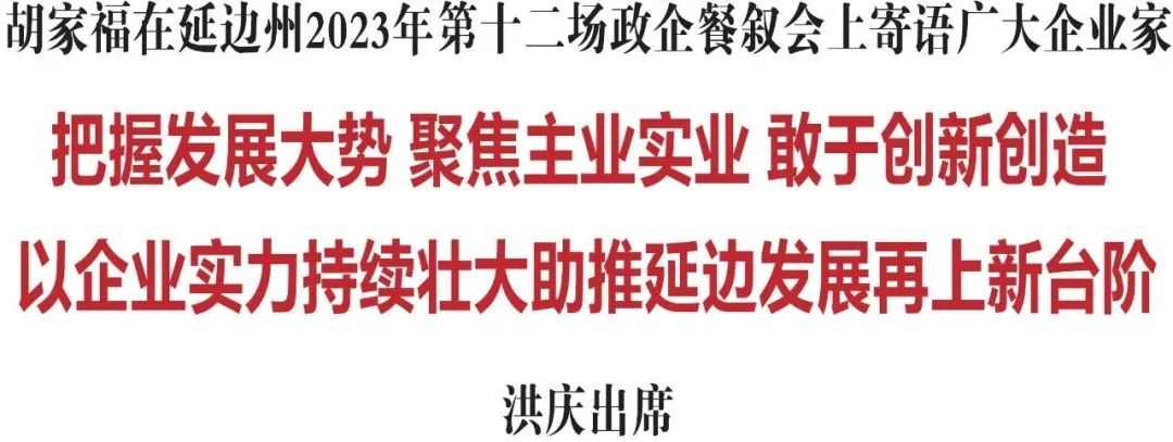 12月26日,年终岁尾之际,我州举行2023年第十二场政企餐叙会,邀请州内不同行业的企业家代表欢聚一堂、共话未来。省委常委、州委书记胡家福出席餐叙会,代表州委、州政府向长期以来关心、支持延边发展的广大企业家致以诚挚问候和美好祝福,并希望广大企业家把握发展大势,聚焦主业实业,敢于创新创造,带领企业实现更好发展、展现更大作为,以企业实力持续壮大助推延边发展再上新台阶。州委副书记、州长洪庆出席餐叙会。