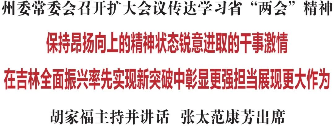 1月30日,省委常委、州委书记胡家福主持召开州委常委会扩大会议,传达学习省“两会”精神,研究部署我州贯彻落实工作。他强调,全州上下要认真学习领会、深入贯彻省“两会”精神,切实把思想和行动统一到省“两会”部署要求上来,始终保持昂扬向上的精神状态、锐意进取的干事激情,真抓实干、攻坚克难,在吉林全面振兴率先实现新突破进程中彰显更强担当、展现更大作为。州人大常委会主任张太范、州政协主席康芳出席会议。