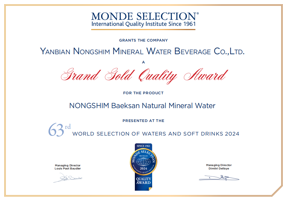 农心白山水曾在去年斩获该奖项。此次再次凭借优越的品质,在视觉、口感、气味、包装、味道等方面赢得组委会专家的青睐,蝉联特金奖。这不仅体现了国际食品界对白山水品质的认可,也展示了安图农心白山水在饮用水领域的实力。