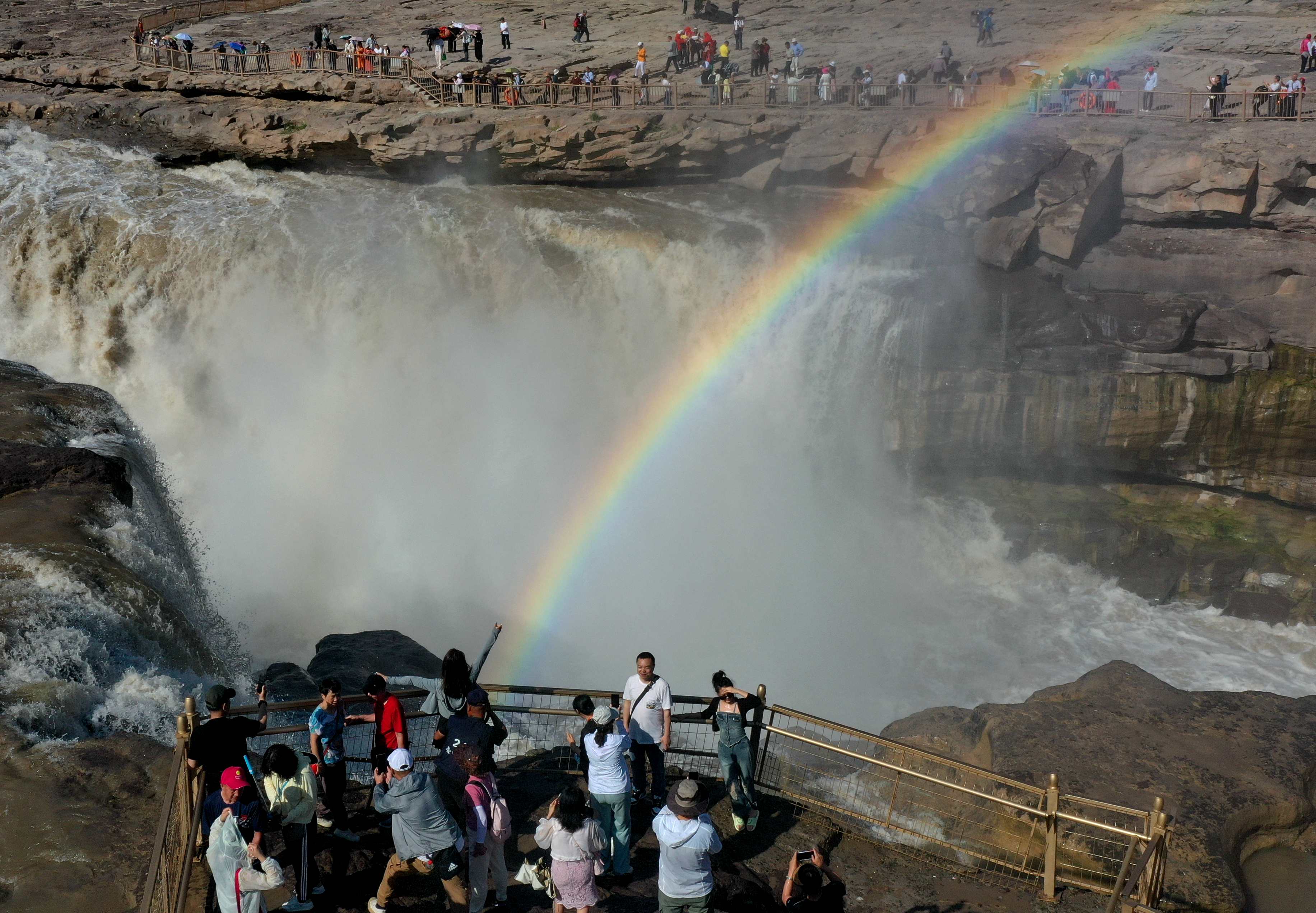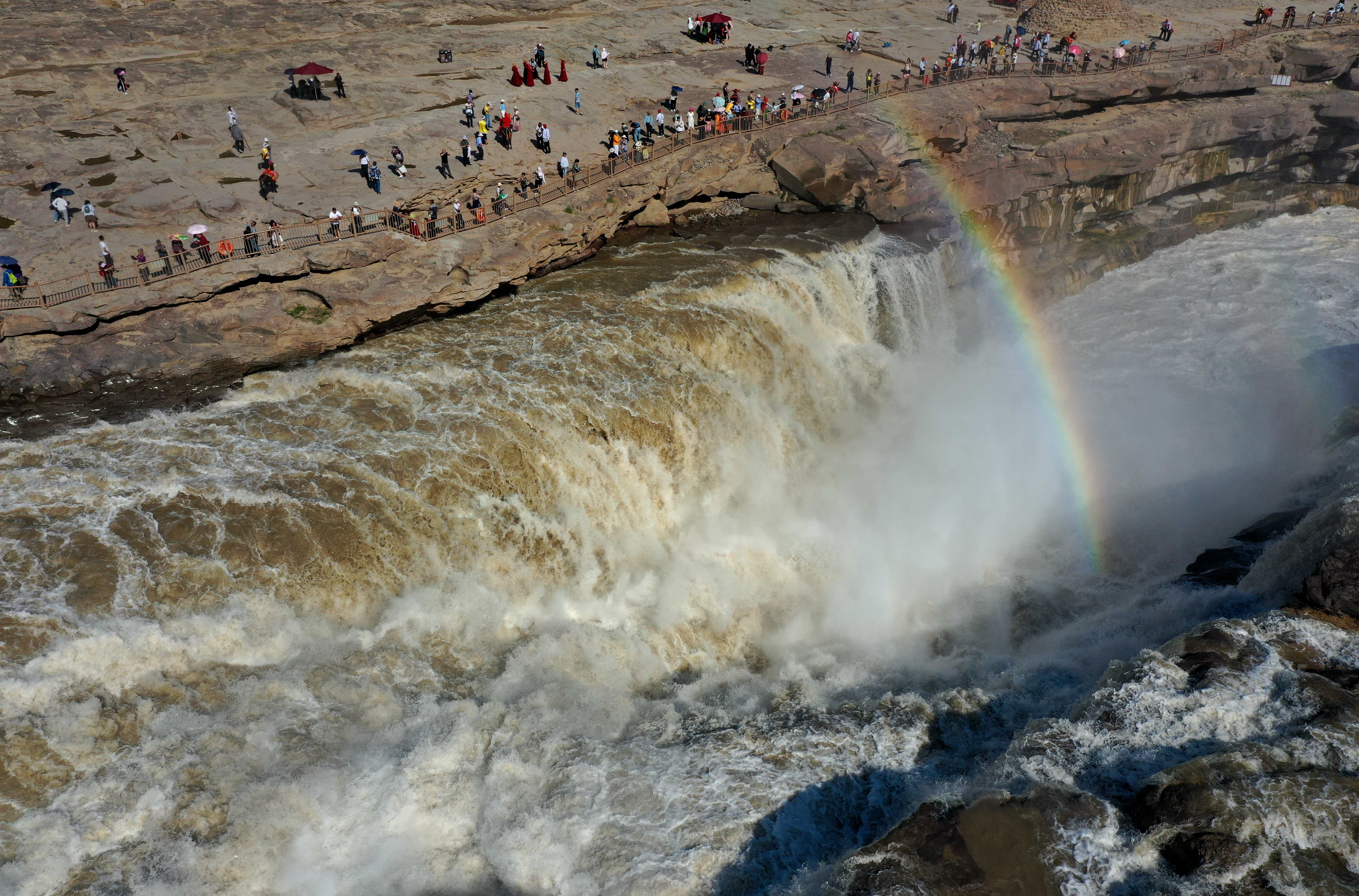 5月27日受降雨影响,黄河壶口瀑布水量增大,河水翻滚而下,飞溅起的水雾在阳光的照射下,形成“彩桥通天”景观。