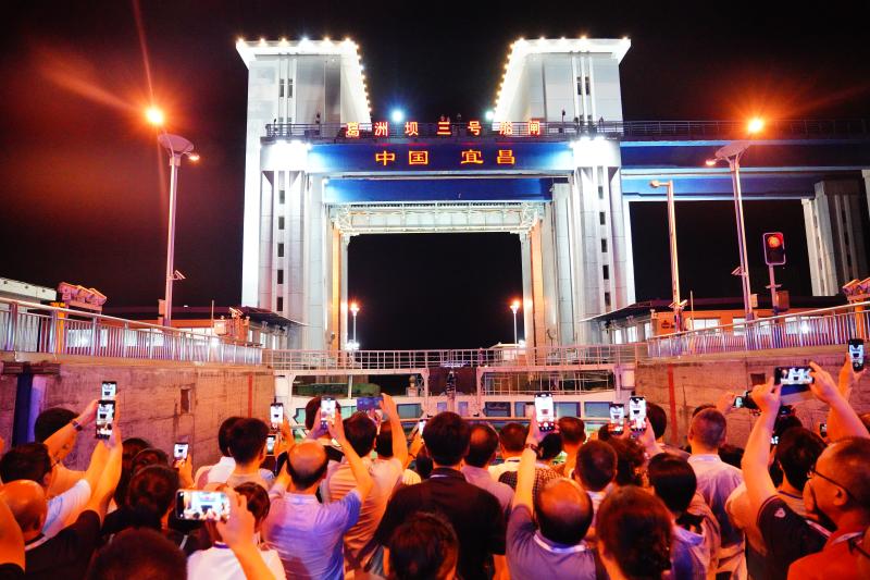 甲板上,民俗歌舞表演引人入胜。北岸灯火辉煌,南山光影绰约。天然塔、万达广场、磨基山、镇江阁等渐次出镜,诗意古韵和时尚建筑浸入一江柔波。过葛洲坝船闸时,嘉宾们纷纷掏出手机打卡拍照,体验“水涨船高”的新奇感。