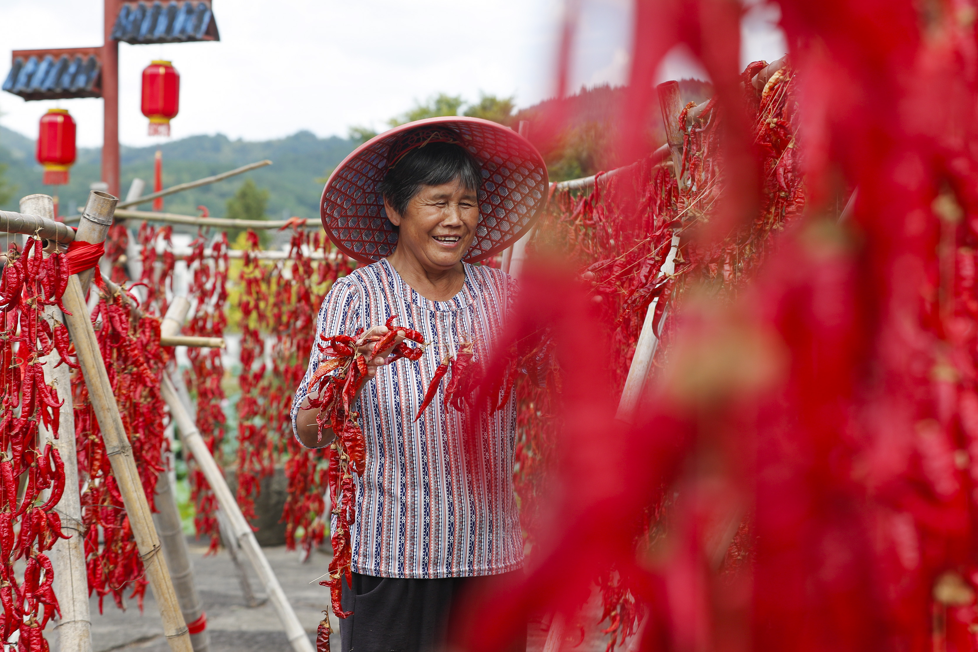 进入秋季,安徽省黄山市徽州区呈坎村村民趁着晴好天气,晾晒玉米、南瓜、红辣椒等农作物,吸引不少游客前往观赏,感受丰收的喜悦。