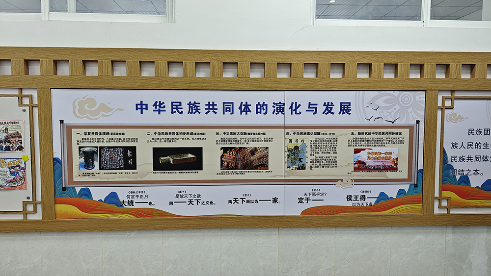 走进校园,以铸牢中华民族共同体意识为主线打造的文化走廊,随处可见“三个离不开”“四个共同”“四个与共”“五个认同”内容标语和展板,师生们可以了解各民族的服装、风俗习惯,懂得各民族间要在理想、信念、文化上团结统一、守望相助。